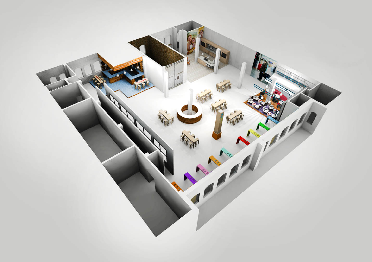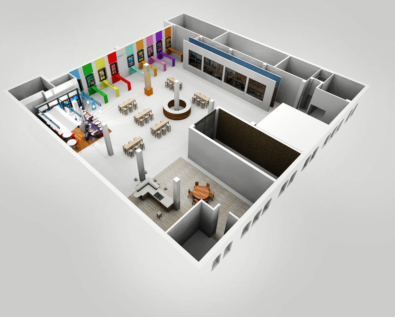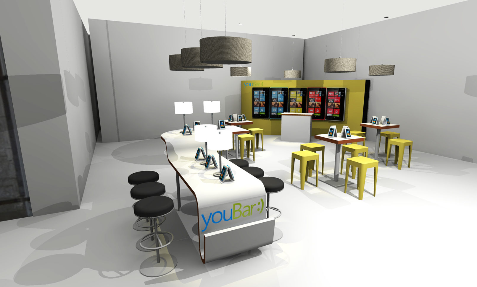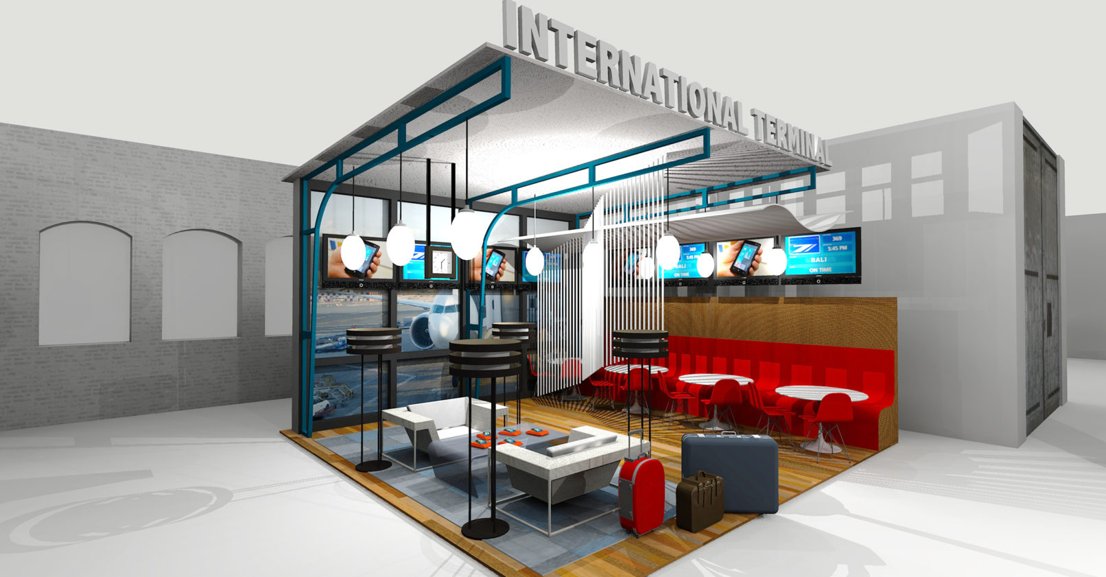 Situated in an event space in a Chelsea loft, this mobile phone launch featured an array of multicolor product displays that mimicked the range of device offerings. Additionally, two immersive scenarios—an airport terminal and café—were built out to show the products in their natural habitats.