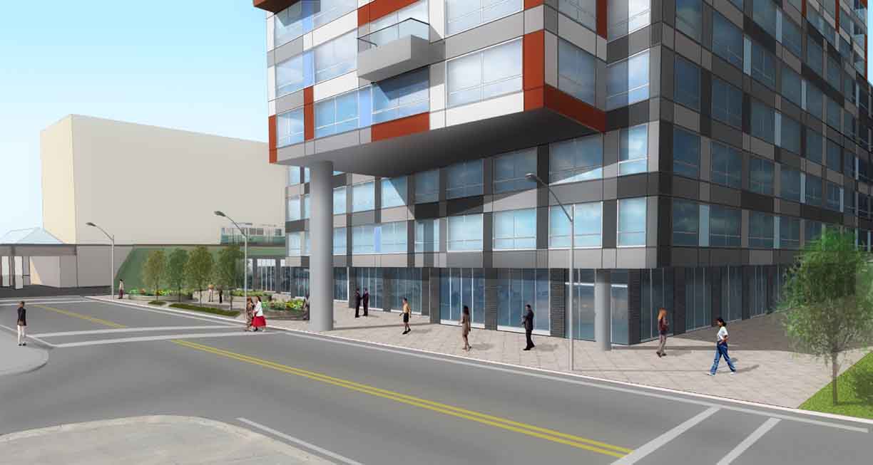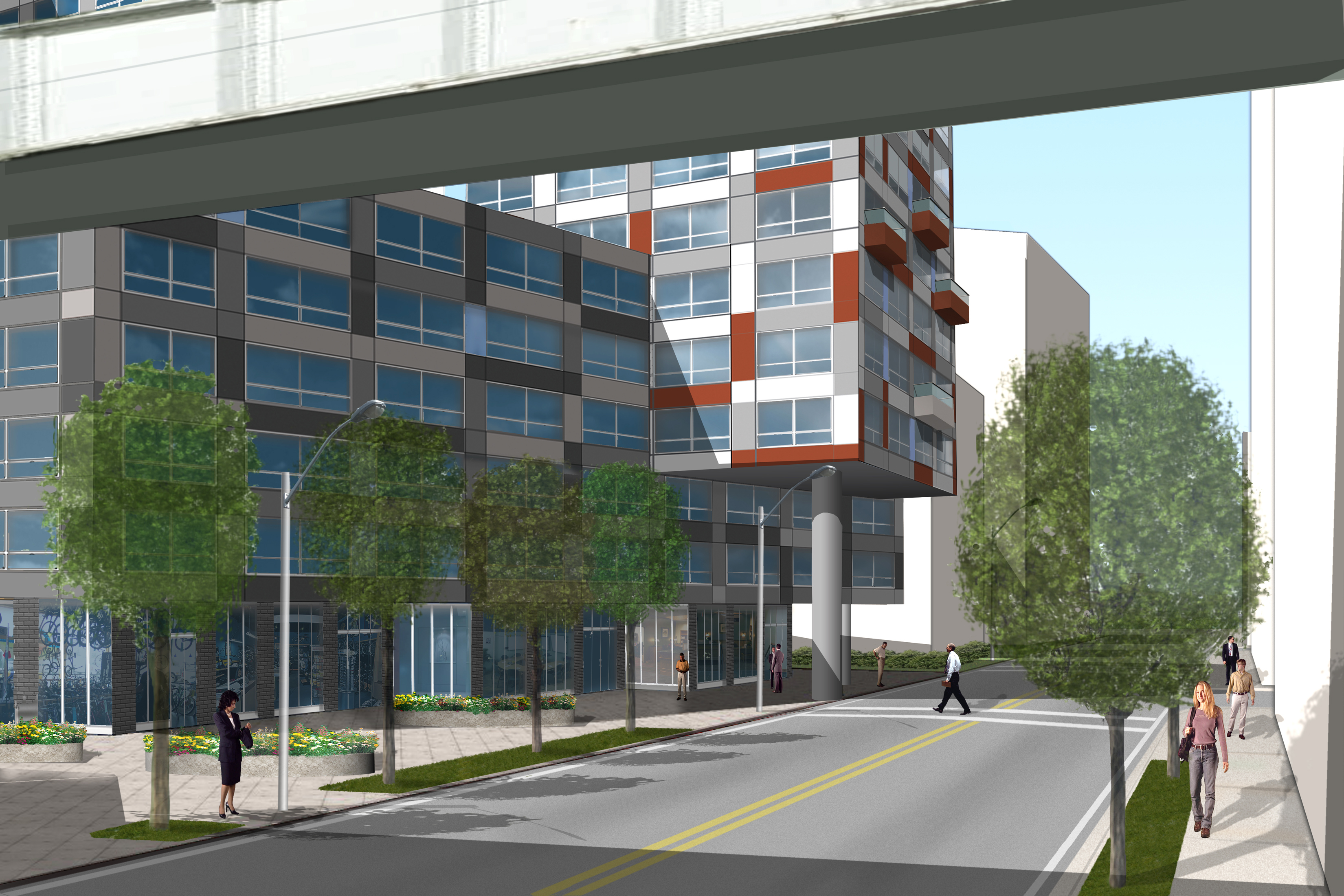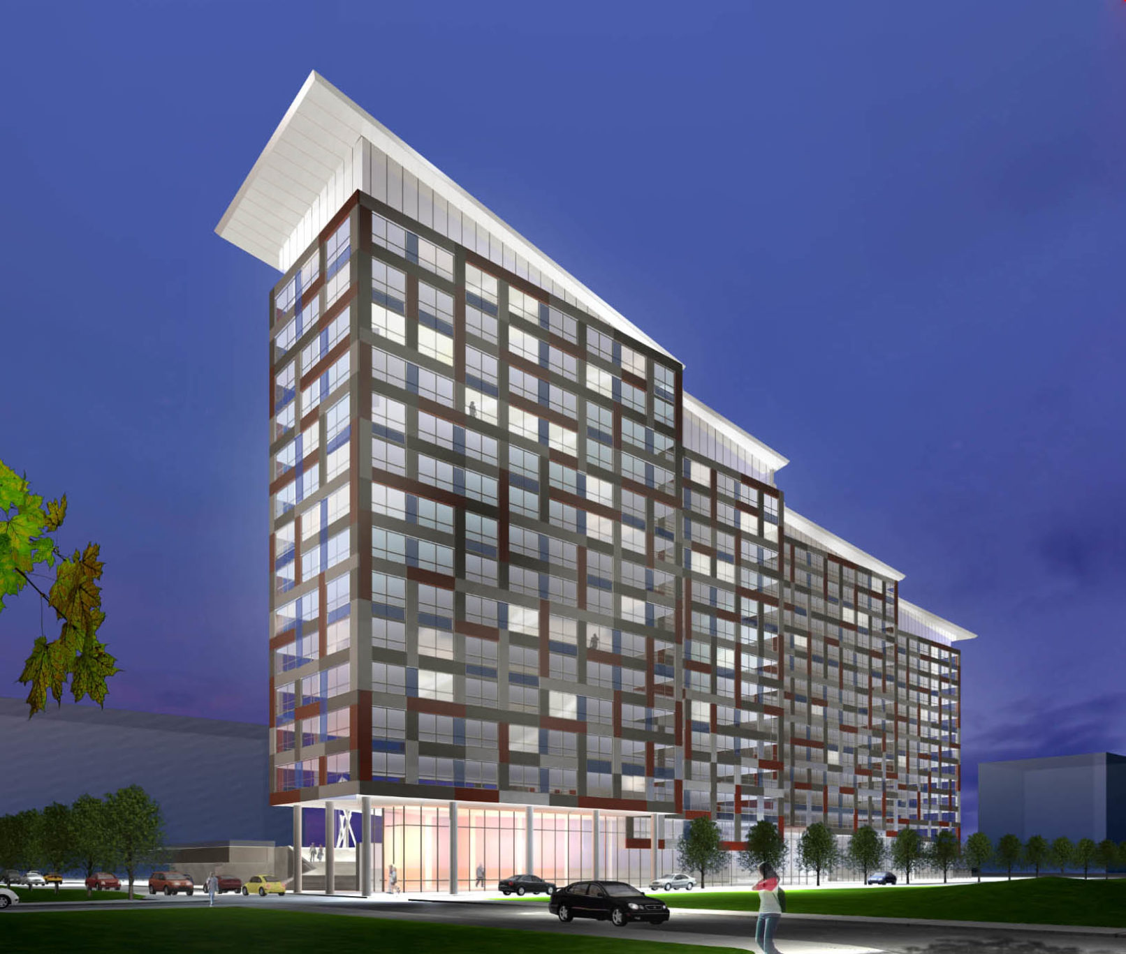 This residential development, situated on the site of a former railroad yard near a future light-rail extension, features three distinct, floating volumes. A patterned facade of interwoven, randomized aluminum panels gives a human scale to the oversize massing.