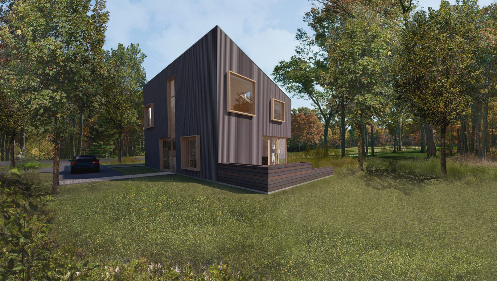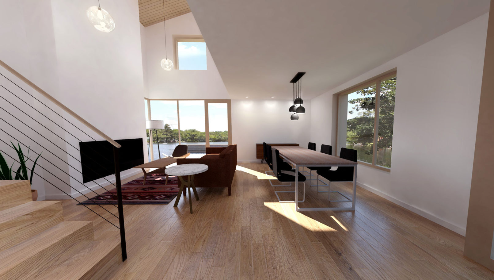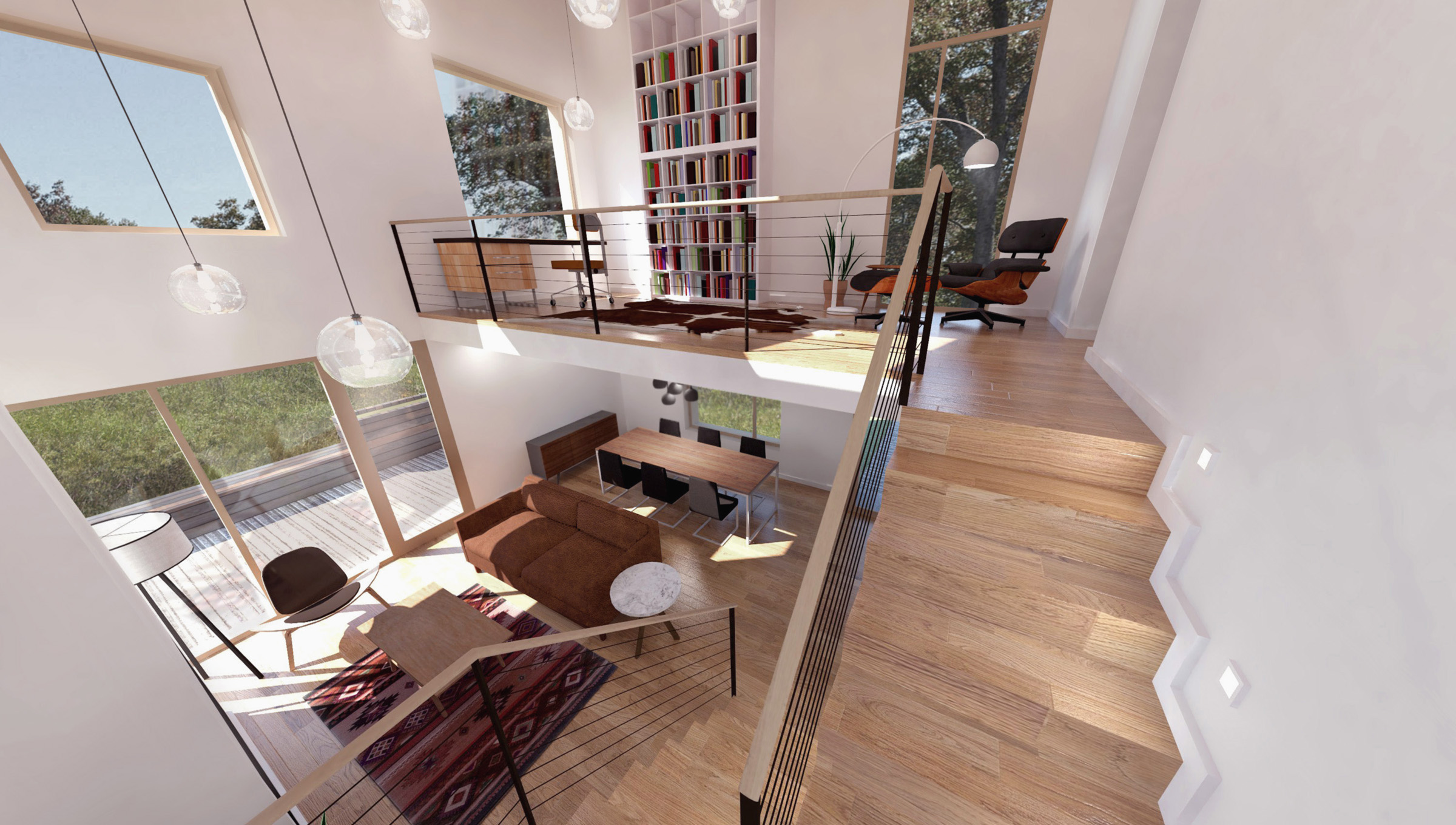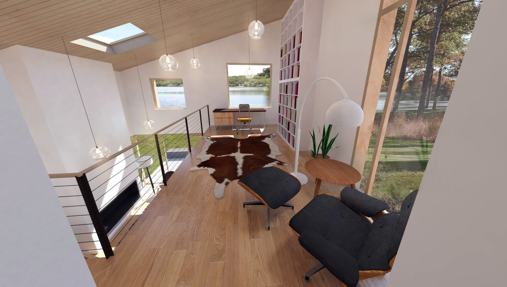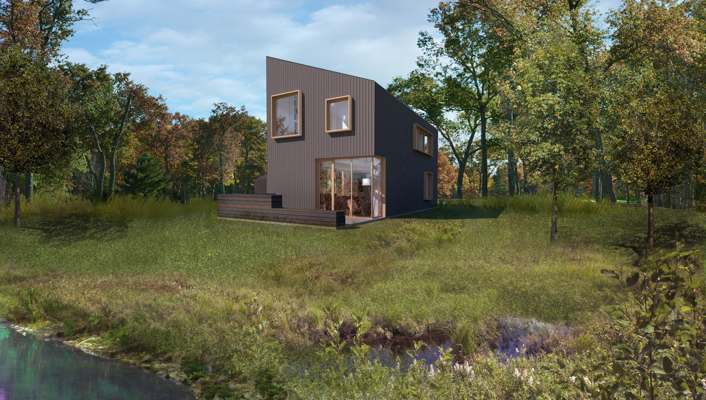 This rustic lakefront retreat sits on a compact, rectangular footprint and engages multiple axes of view and circulation. The centerpiece is a double-height living room with a sloping shed roof and towering fireplace. A compact switchback stair on the transverse axis flows directly from the front door, bisecting the kitchen and dining area, serving as a backdrop for the main room. The plan features three bedrooms and two bathrooms over two floors, plus an open, lofted library that is perched above the living room. The exterior is clad in gray corrugated aluminum. Although appearing randomized, each window aperture frames a view from a specific room in the building. Additionally, full-height window walls near the patio and entry add brief moments of transparency.