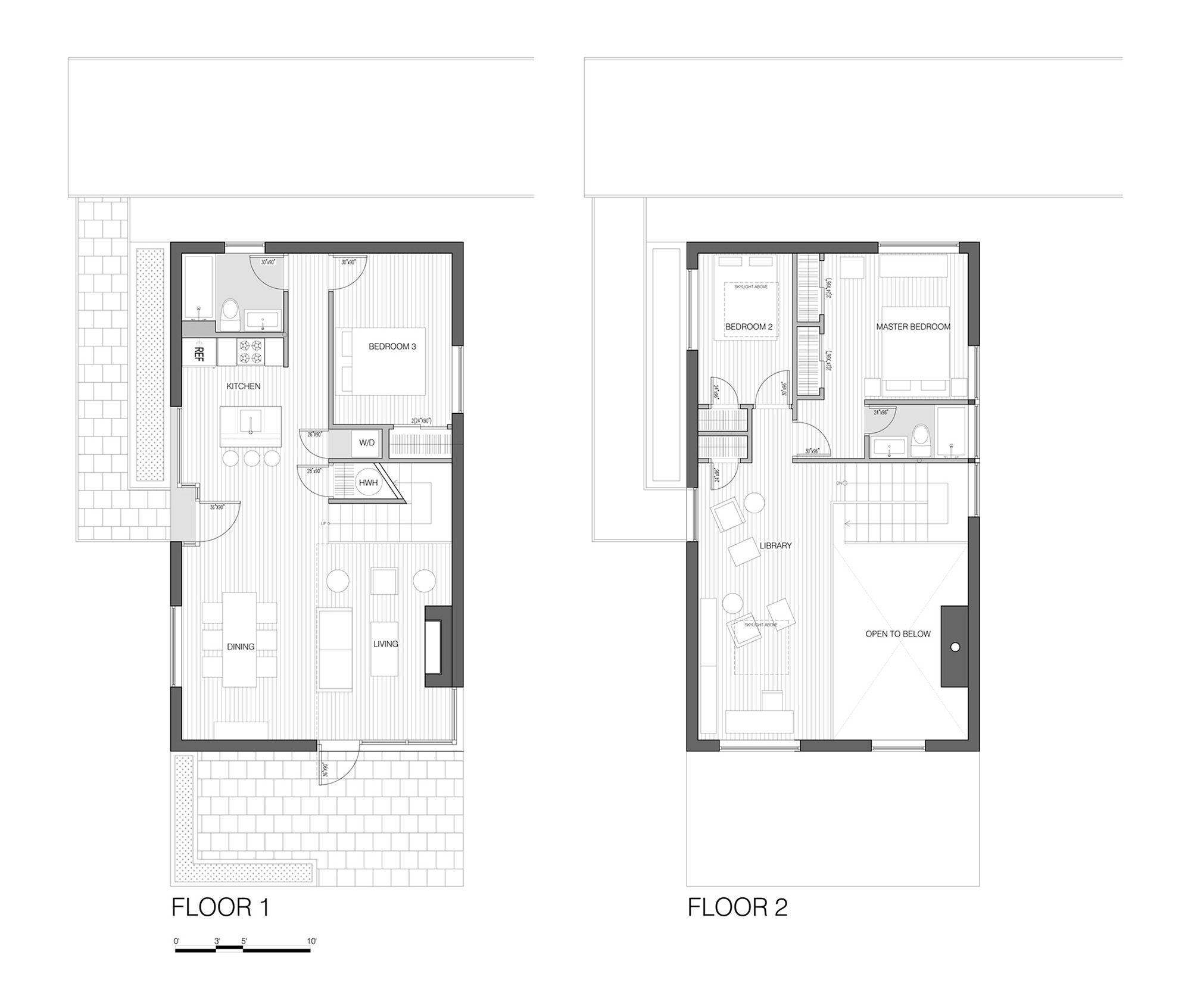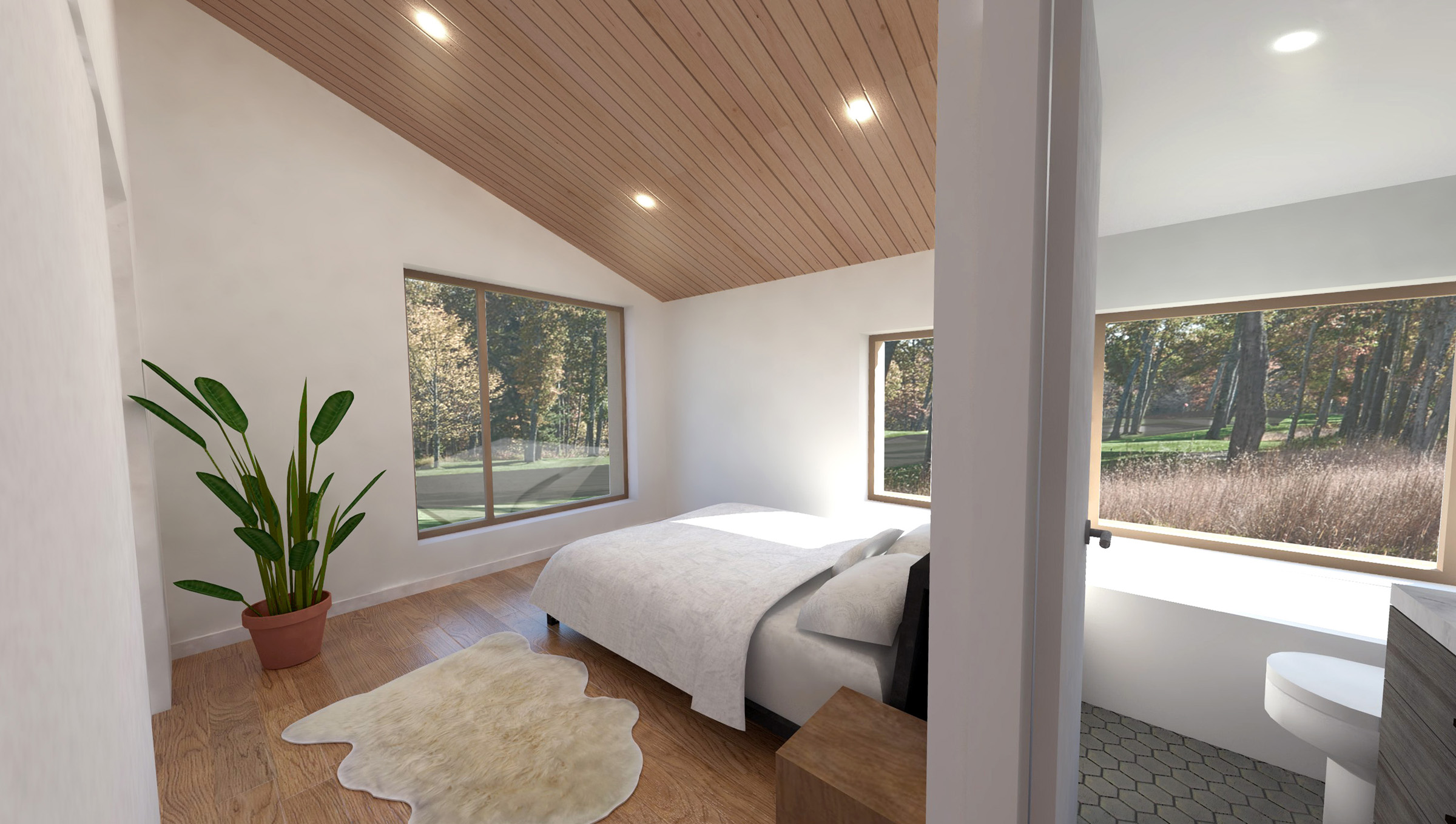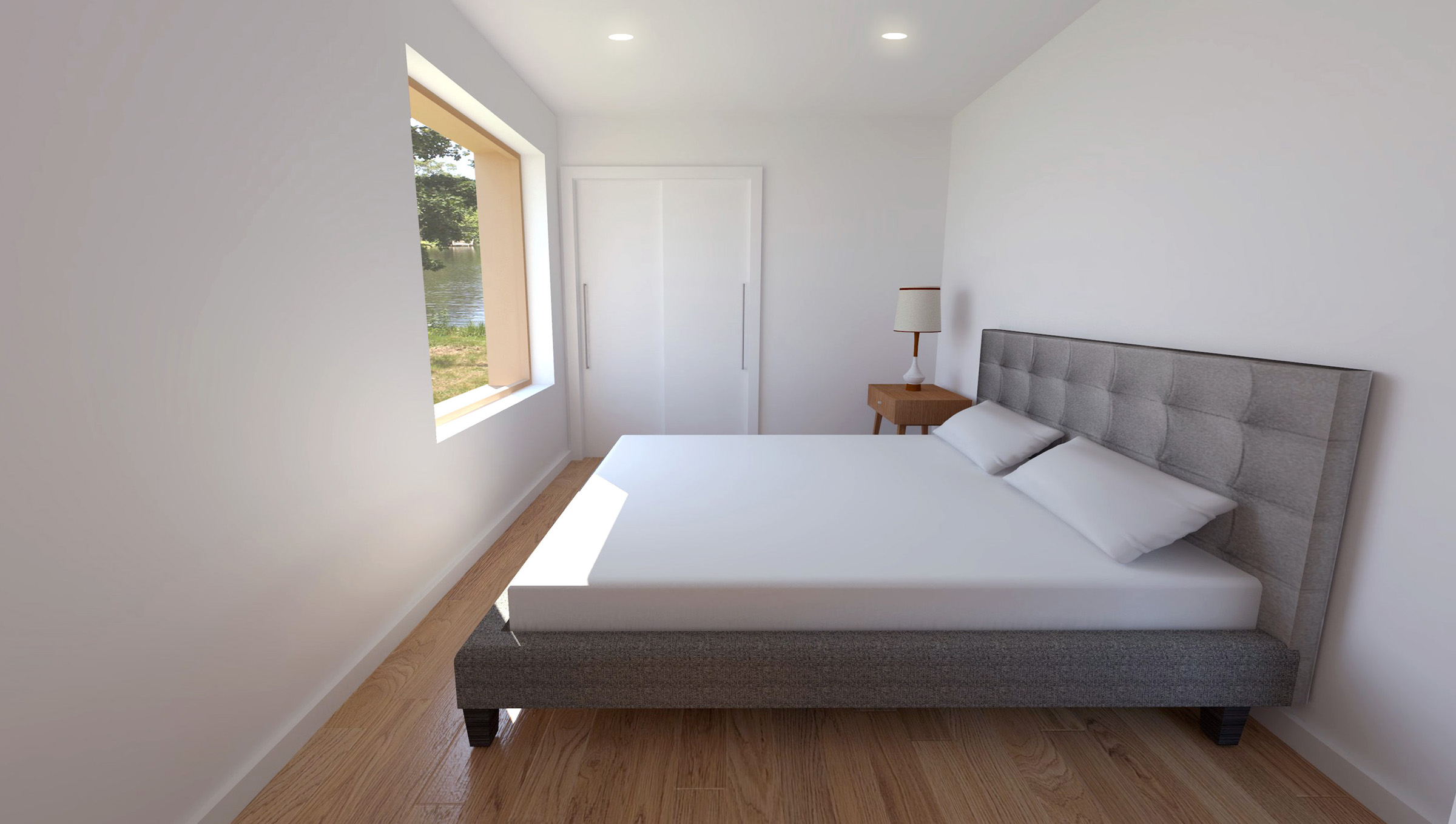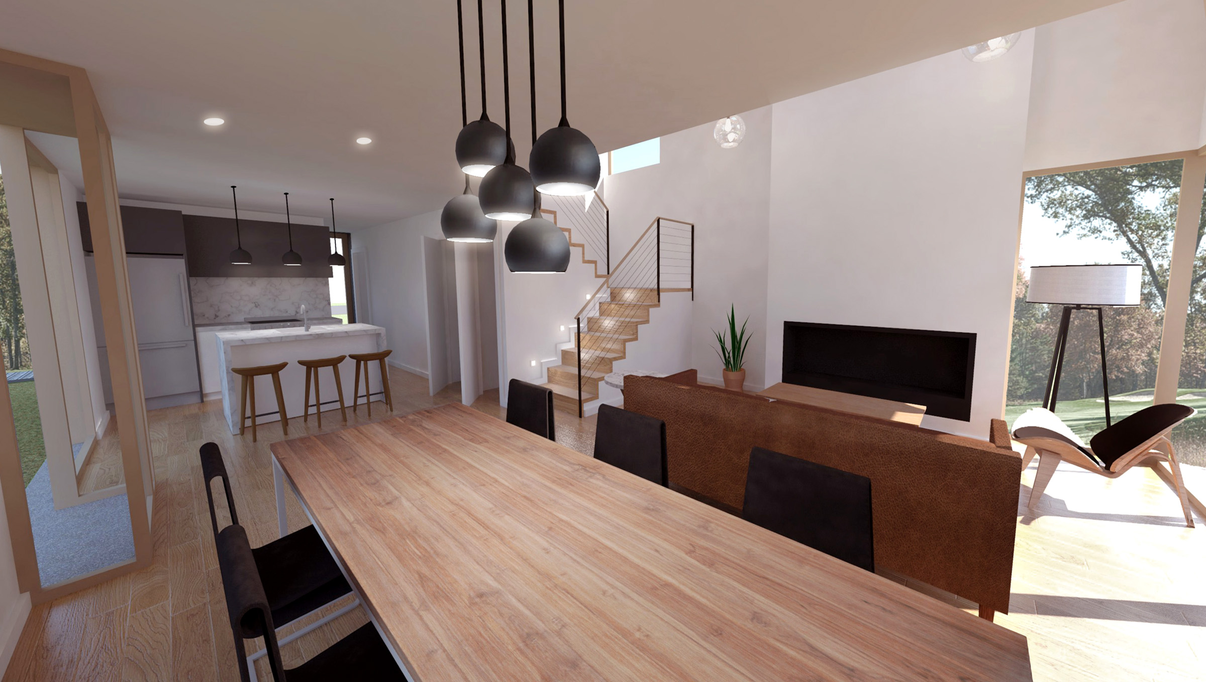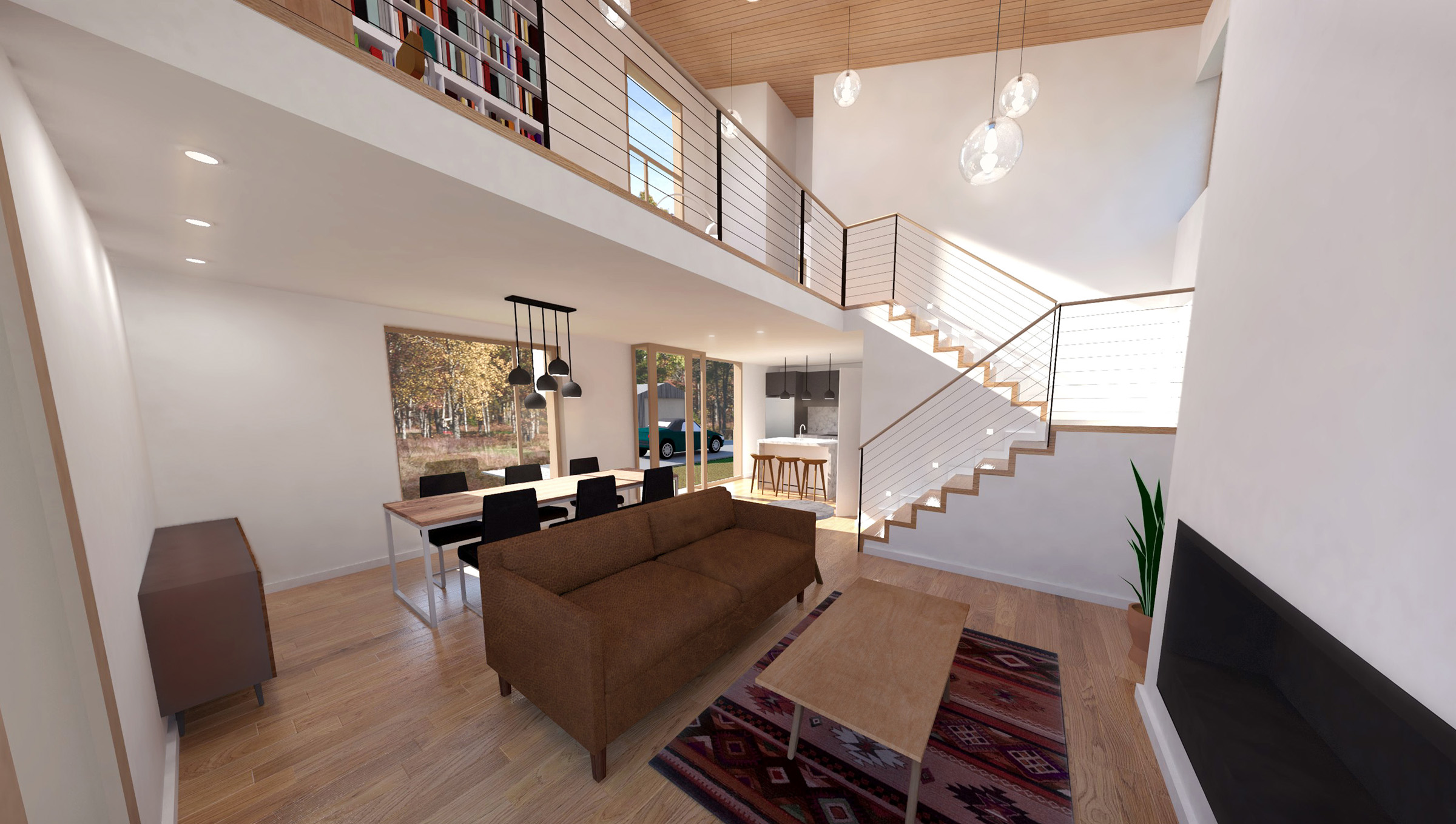 This rustic lakefront retreat sits on a compact, rectangular footprint and engages multiple axes of view and circulation. The centerpiece is a double-height living room with a sloping shed roof and towering fireplace. A compact switchback stair on the transverse axis flows directly from the front door, bisecting the kitchen and dining area, serving as a backdrop for the main room. The plan features three bedrooms and two bathrooms over two floors, plus an open, lofted library that is perched above the living room. The exterior is clad in gray corrugated aluminum. Although appearing randomized, each window aperture frames a view from a specific room in the building. Additionally, full-height window walls near the patio and entry add brief moments of transparency.