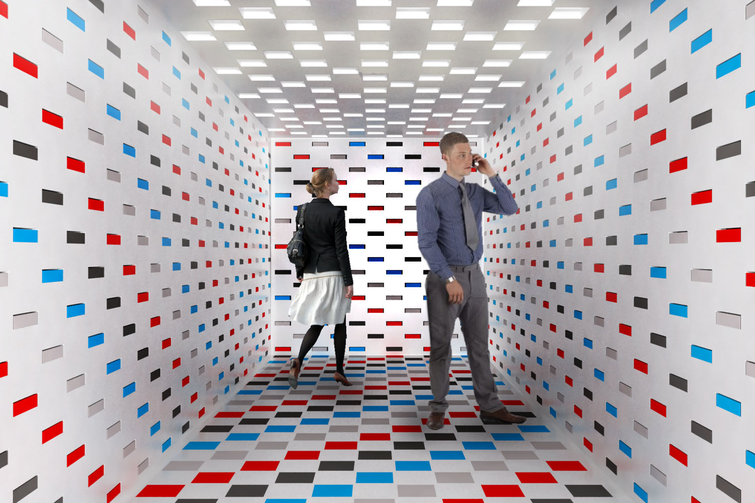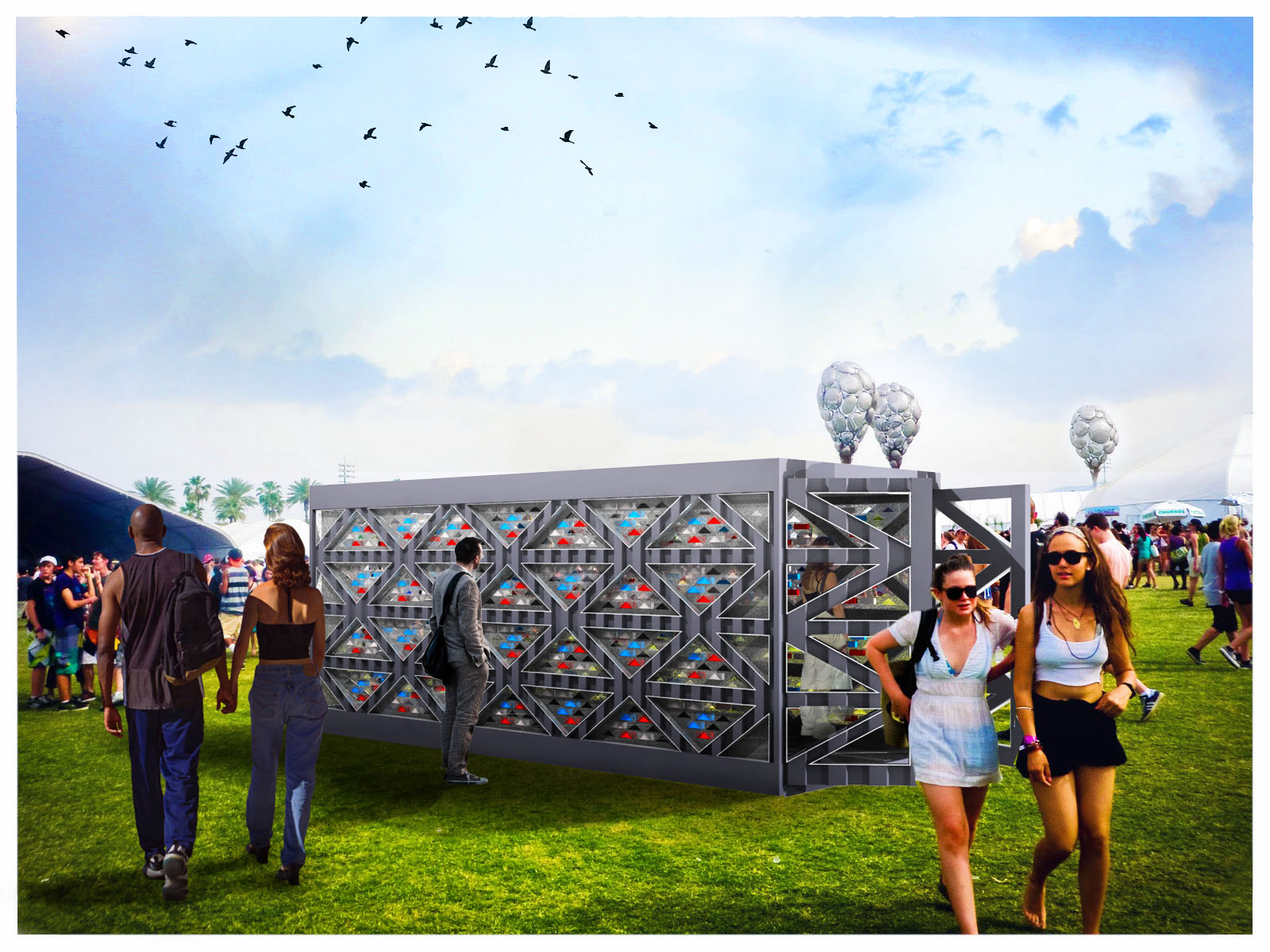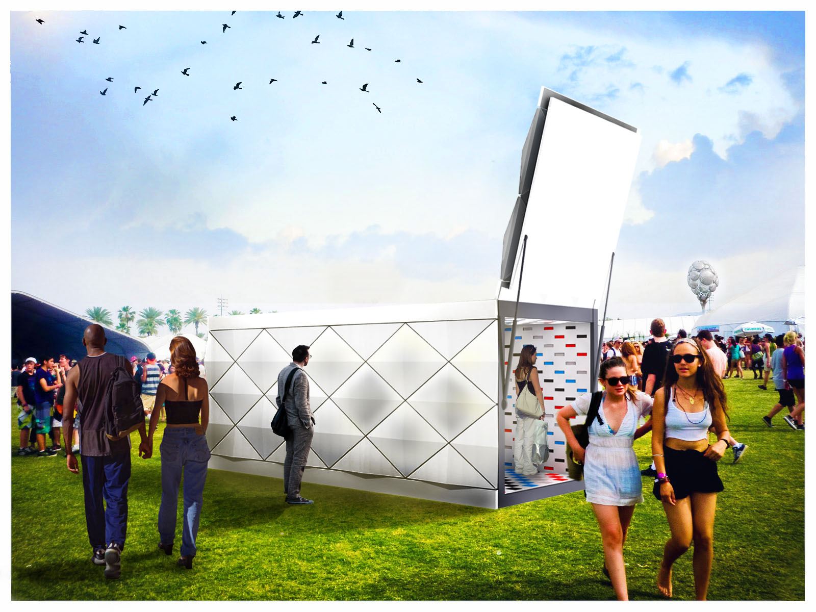 The client’s objective was to create a dynamic, mobile storefront to display a new line of portable USB stereos at a summer music festival. Using the product’s diagrid pattern as a design prompt, the proposed module features a repeating cut-and-fold operation. Triangular product display shelves emerge from the incisions in the walls of the metal shipping container, bringing kaleidoscopic patterns of light into an otherwise compact space.