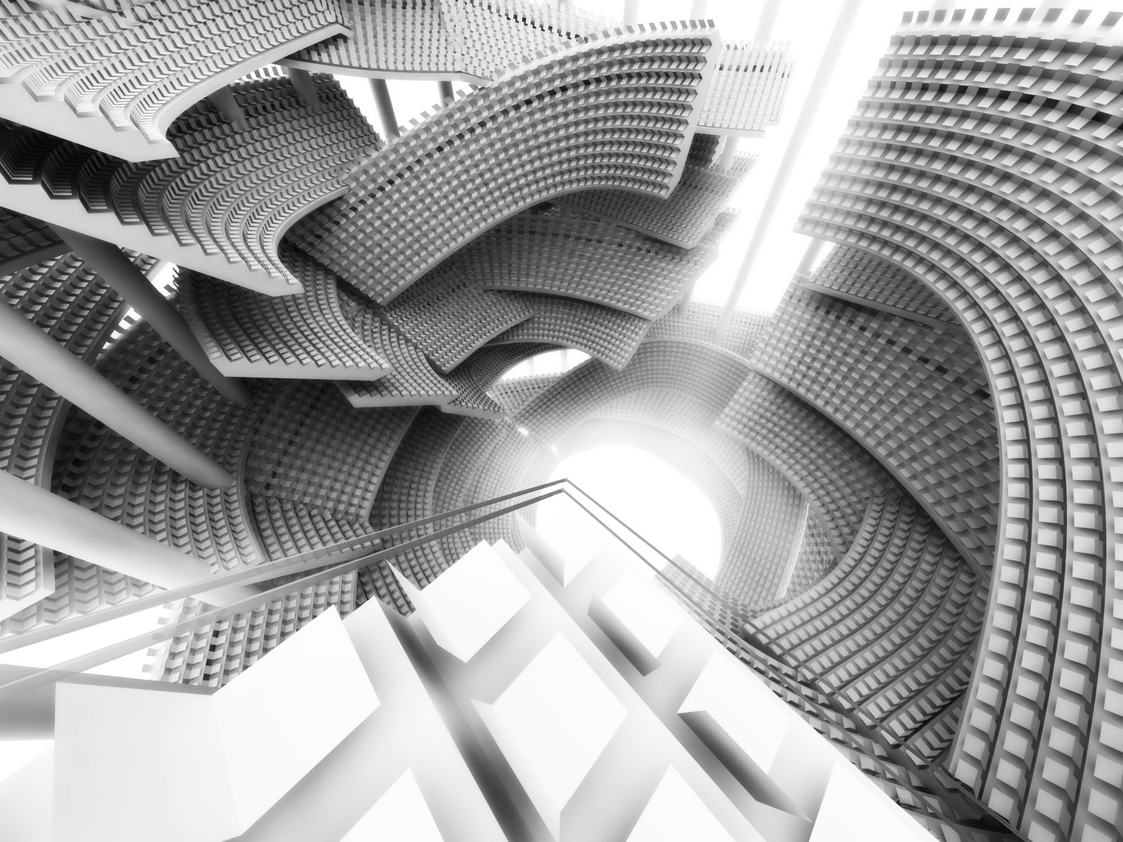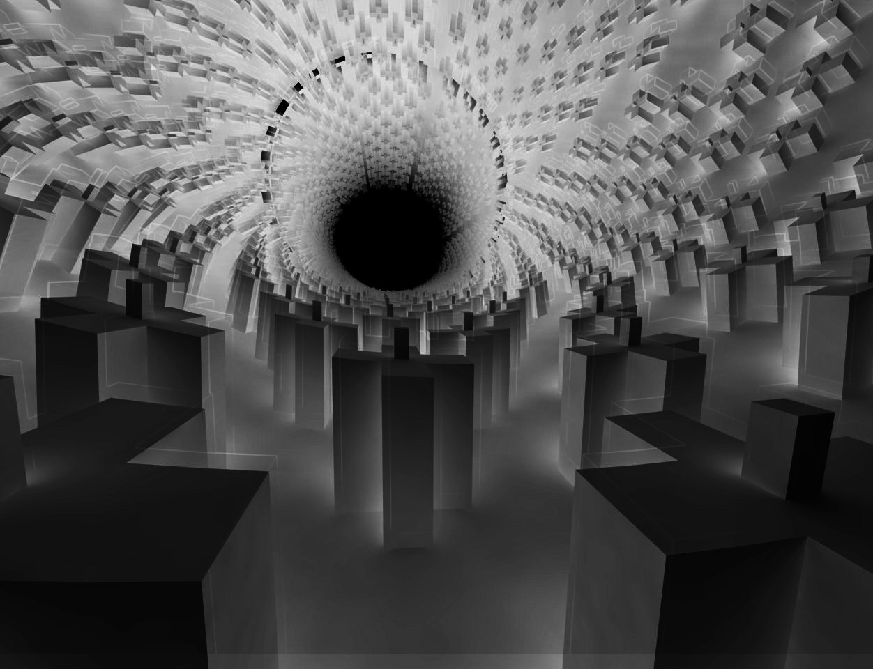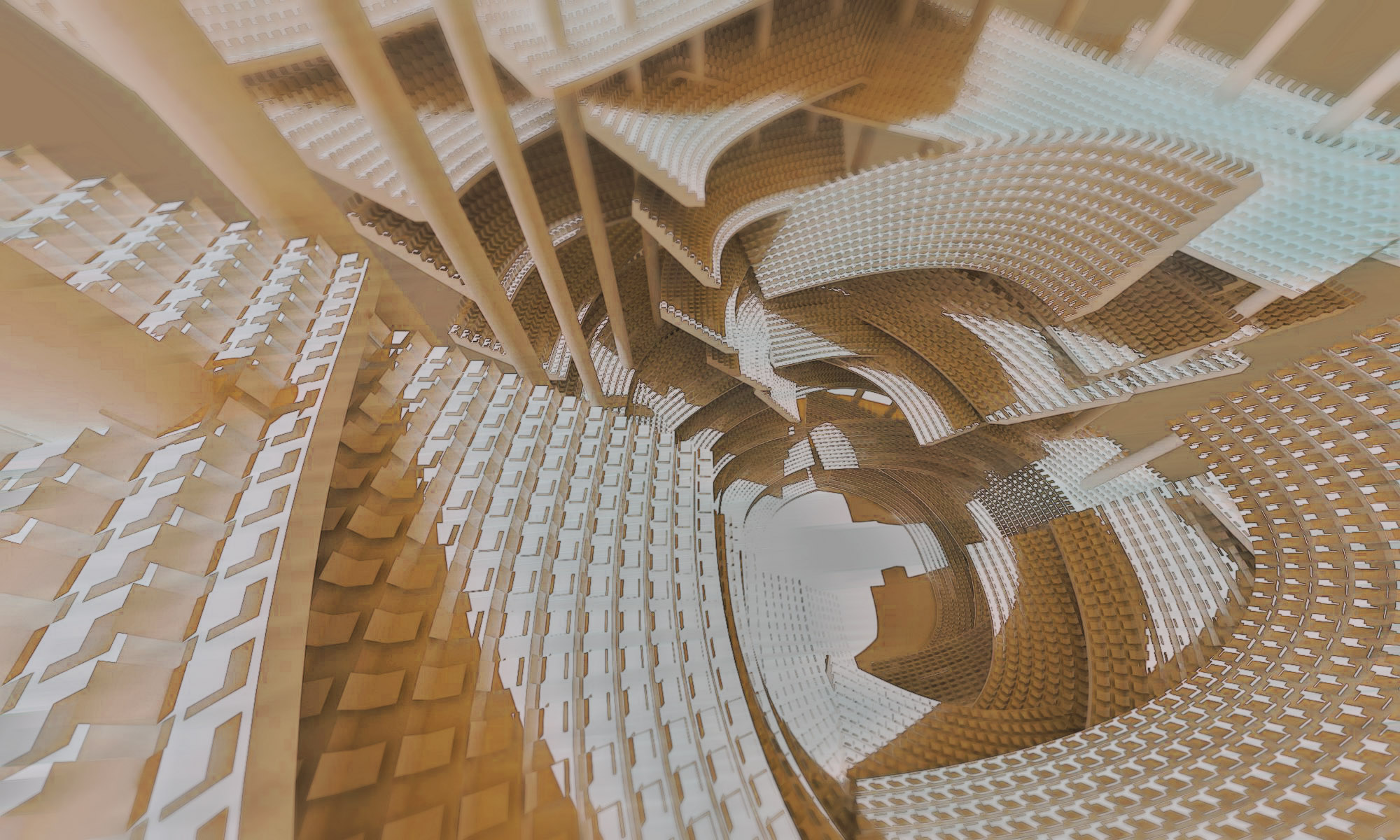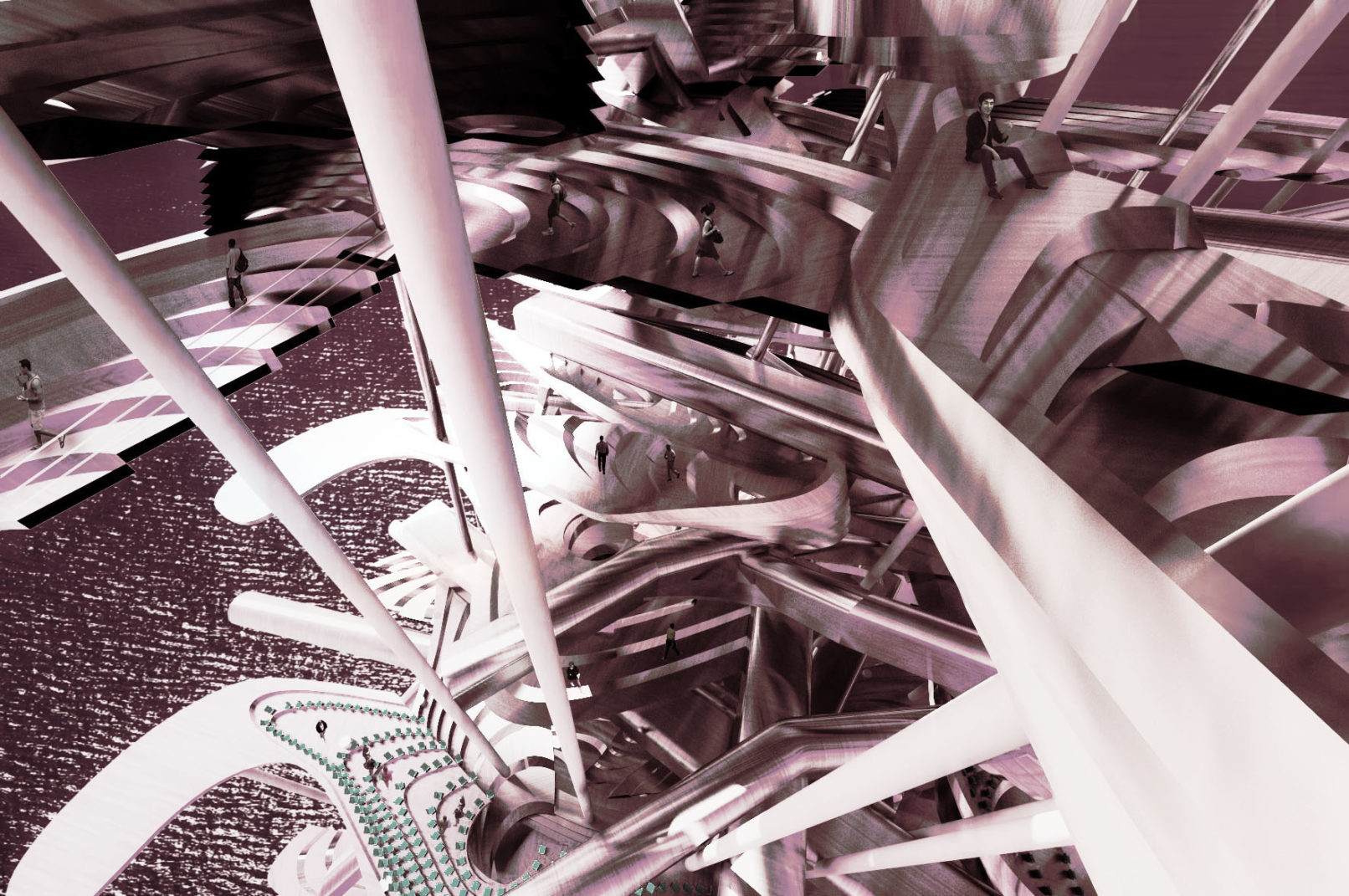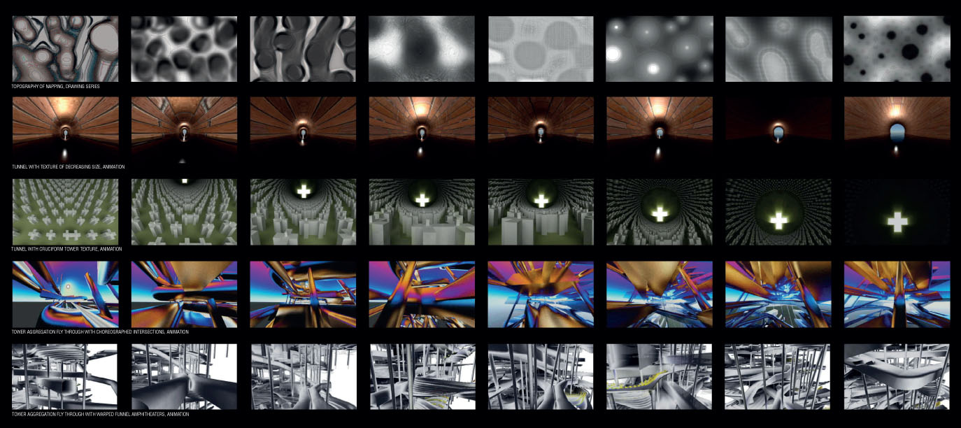 The tunnels are aggregated into an underground and above-ground tower megastructurean infinitely extending accumulation of tunnels, staircases, and stadium seating. An animated fly-through video sequence of the tower explores how architectural textures can influence optic flow.