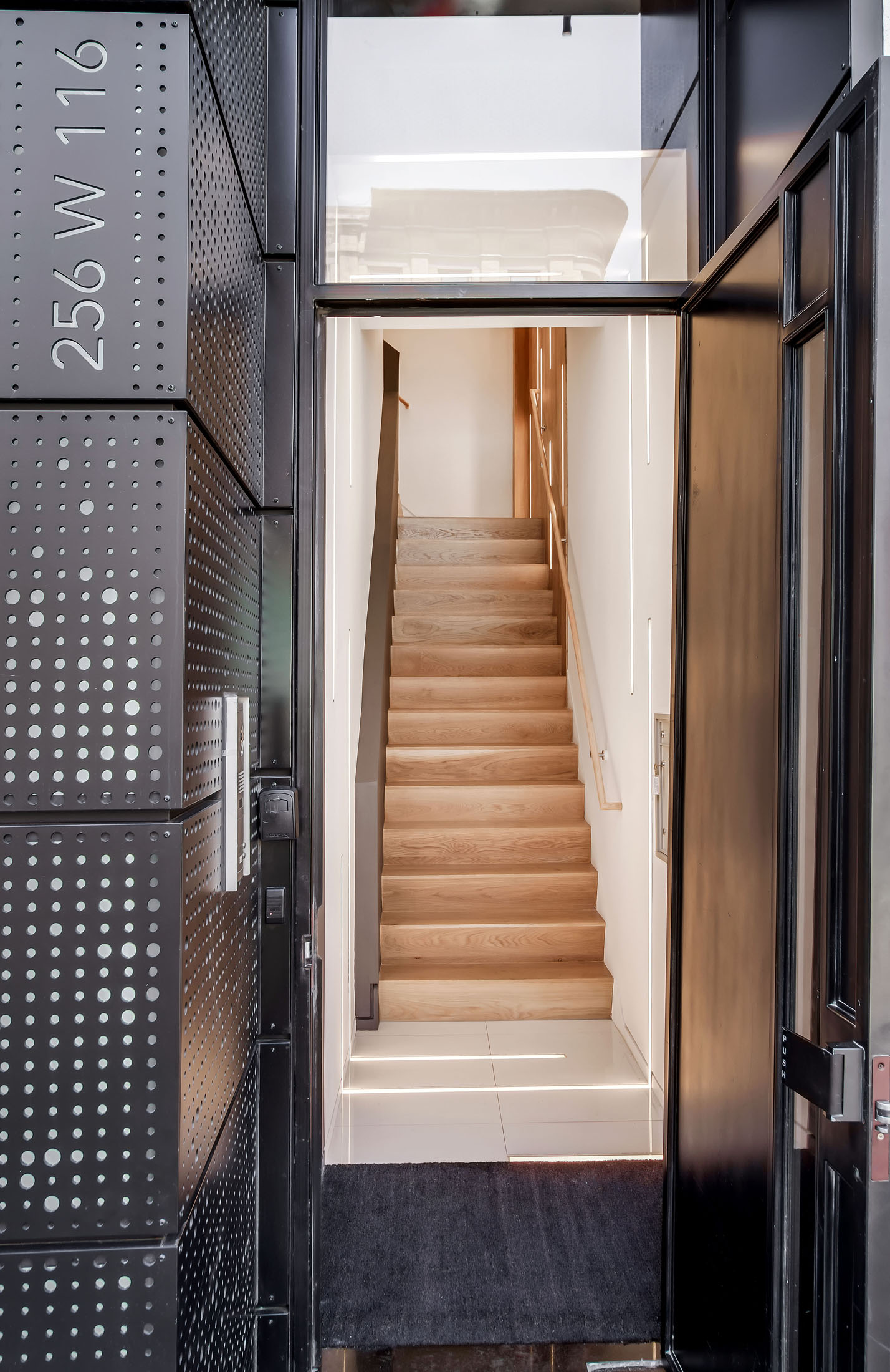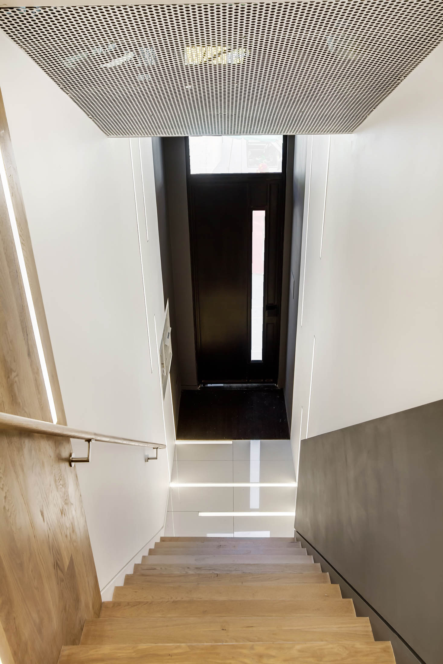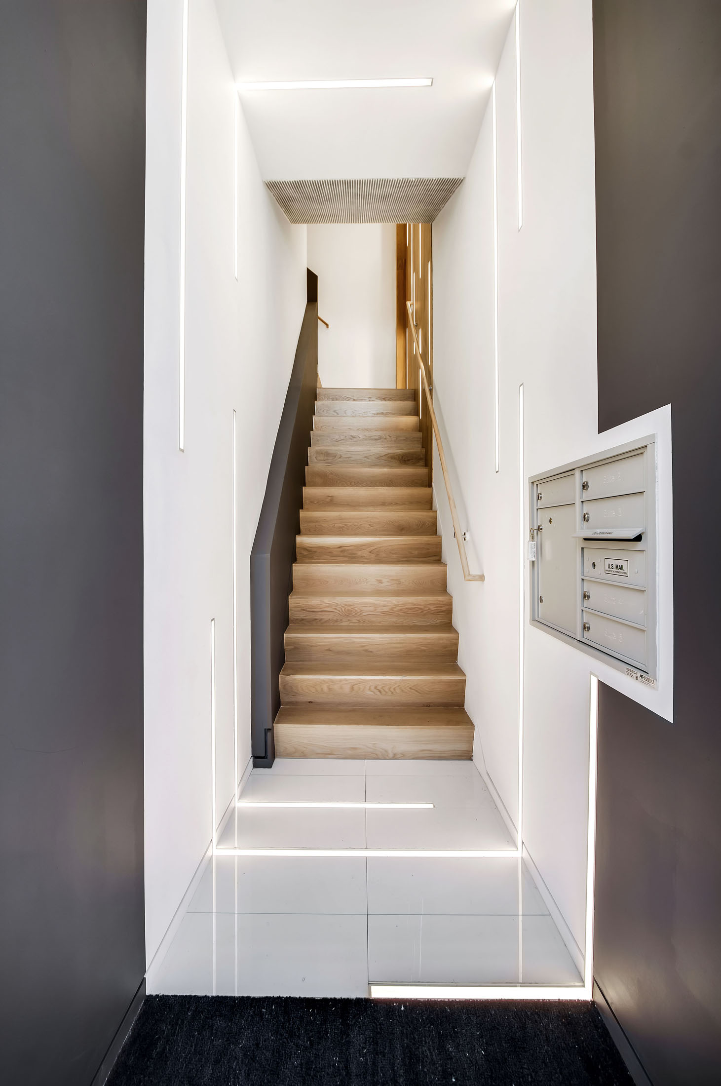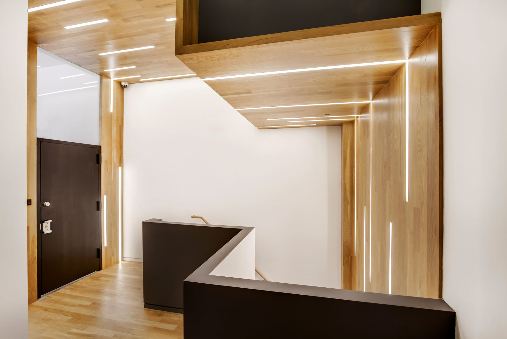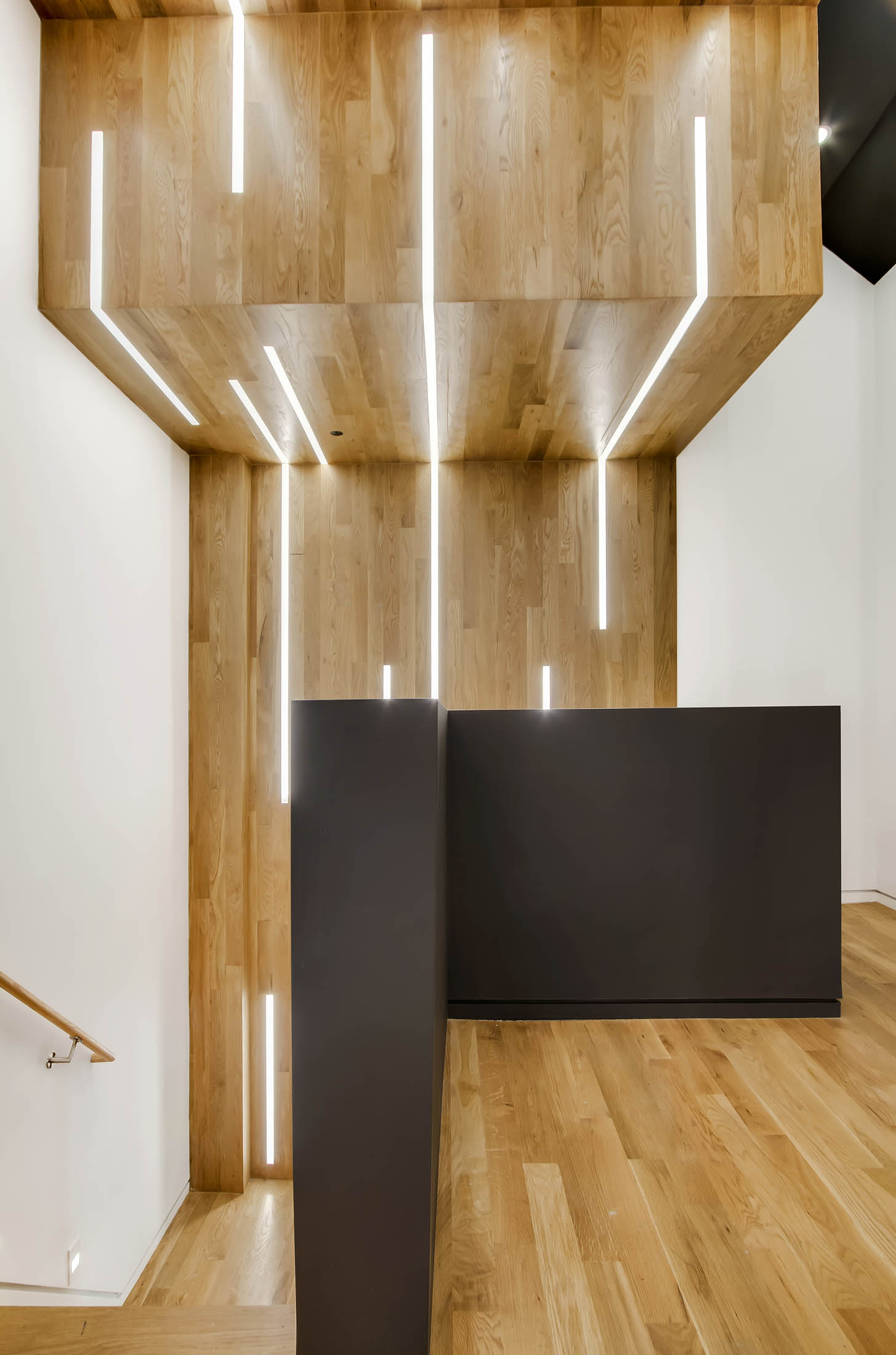 The focal point of the project is a folding white oak waterfall with integrated LED strip lighting, which rises up from the stair penetration and vaults across the ceiling of the second floor. On the exterior, a backlit sidelight clad in perforated steel panels augments a custom oversize entrance door. At the street level, lights are embedded in the porcelain floor tile and proceed to wrap up the wall and around the ceiling, creating a tunnel effect. The project also includes a number of high-end details, including baseboard reveals, step lights, flush-nose stair treads, and a new glass transom.