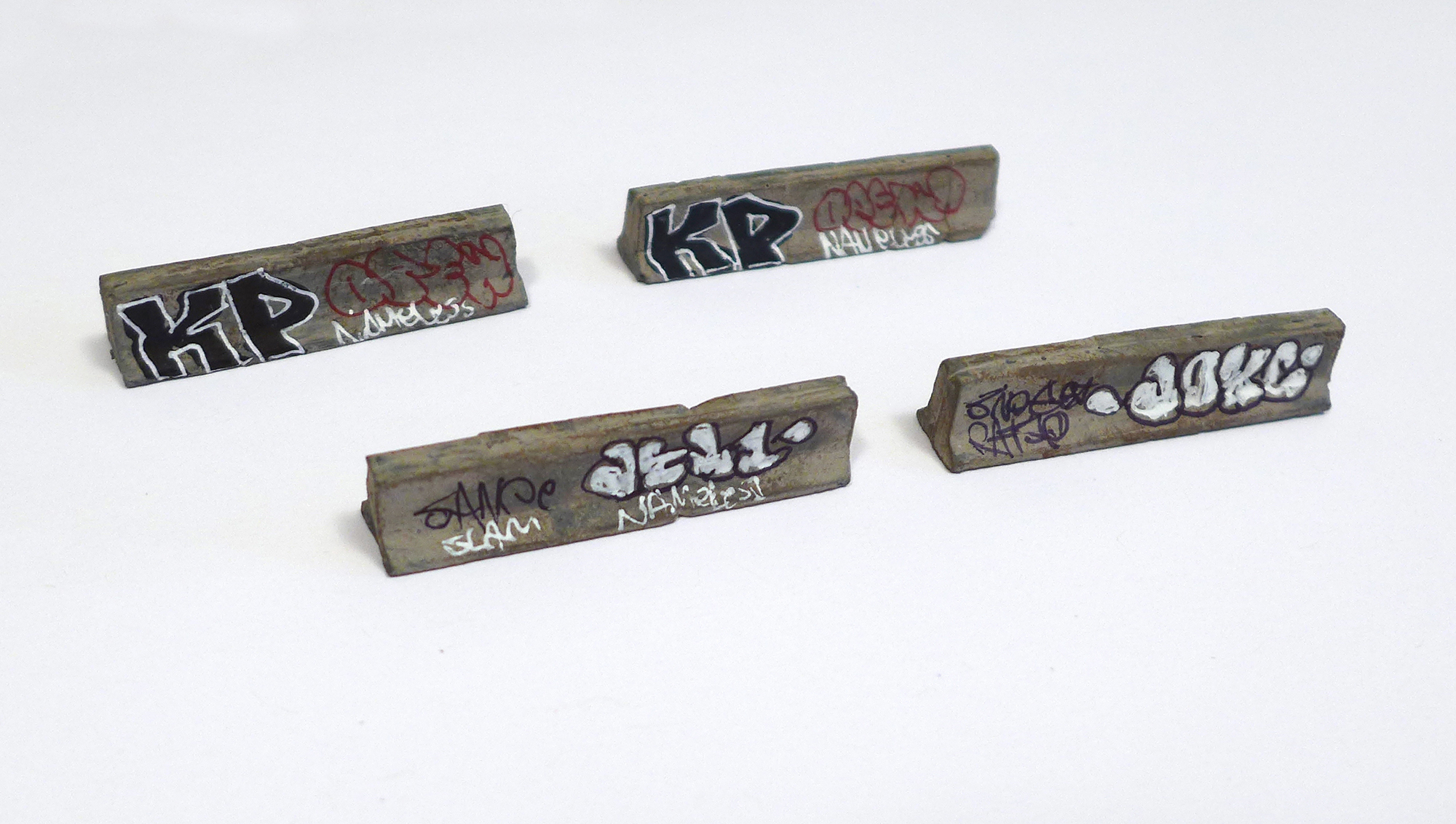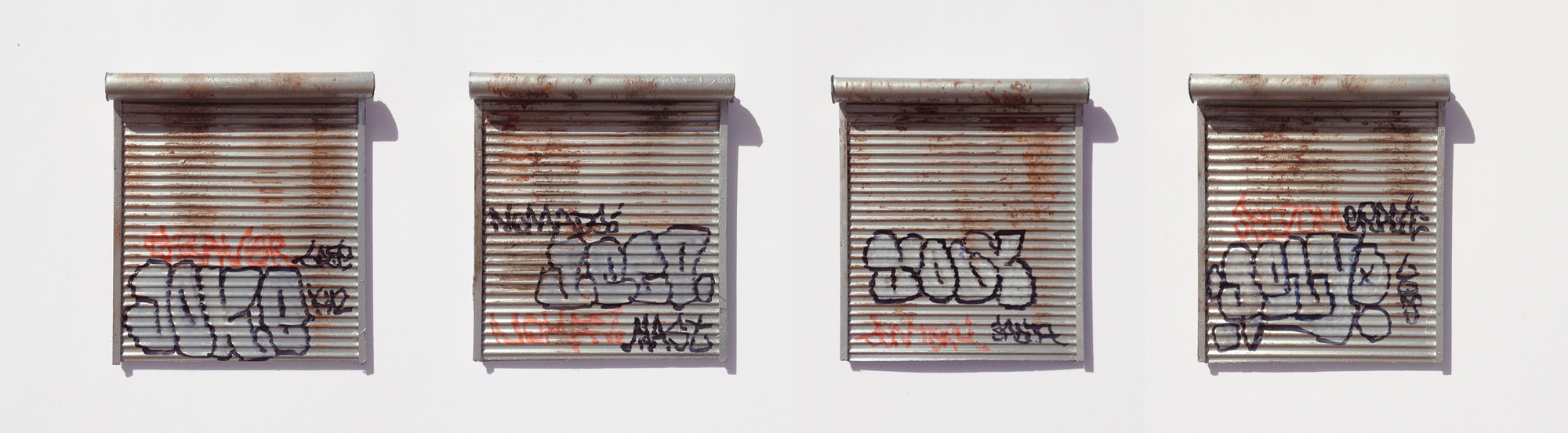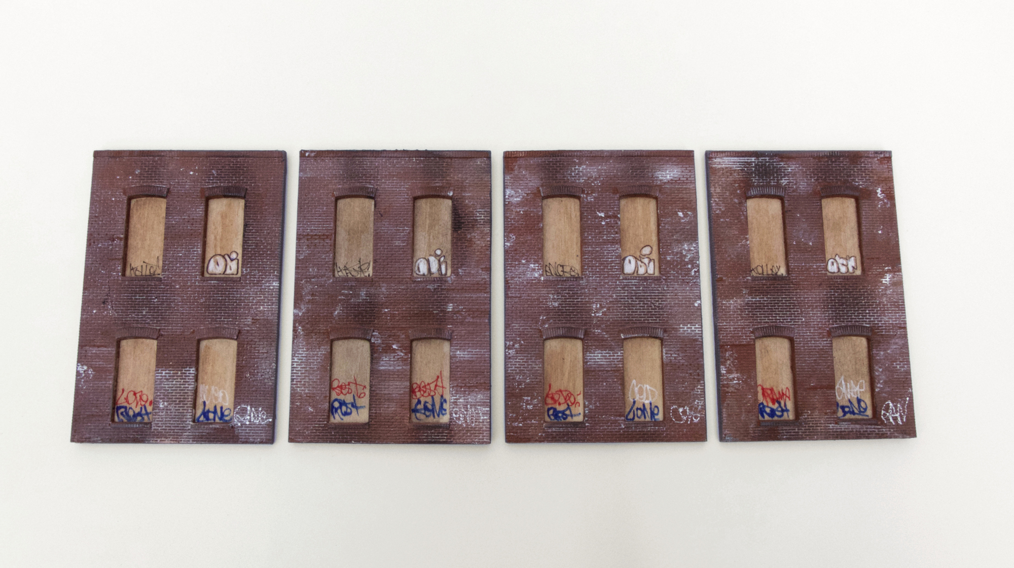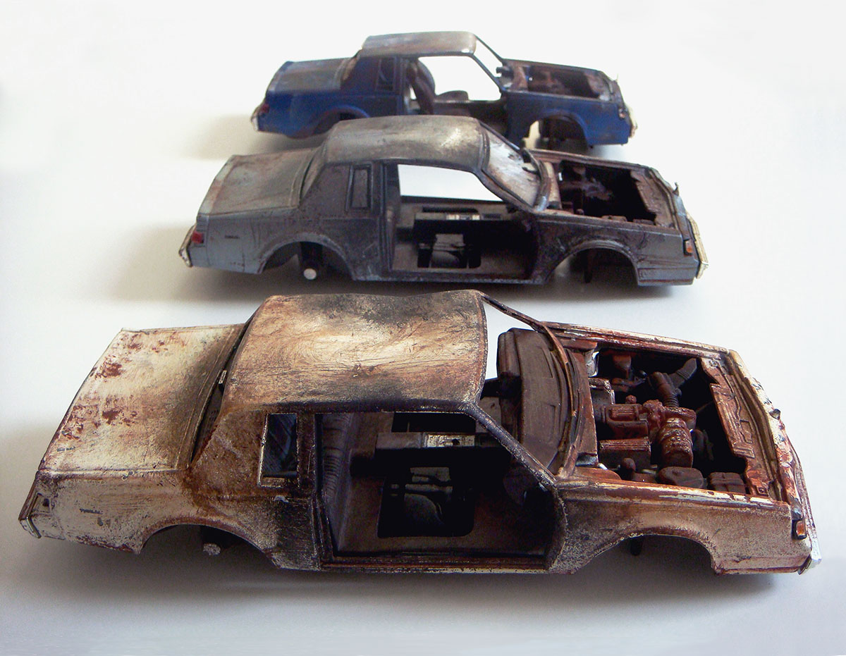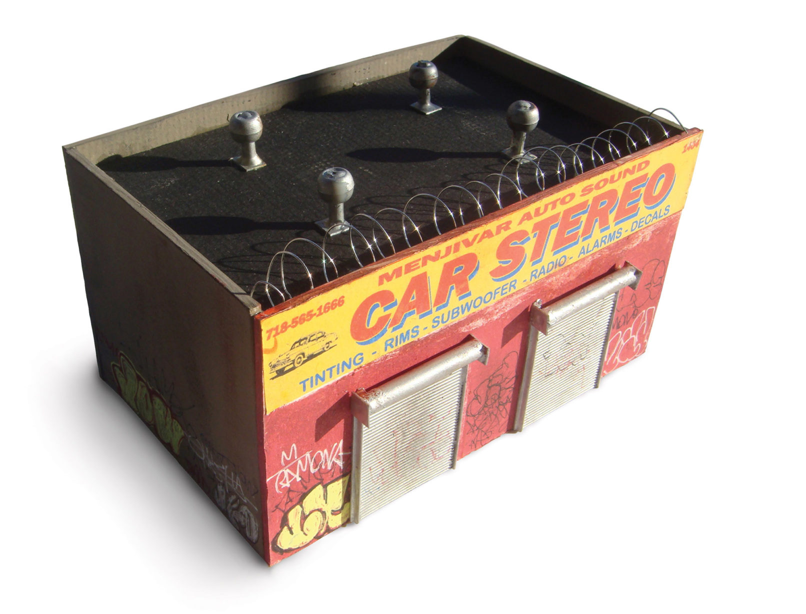 While the Street-Smart series intended to create immersive, miniature urban experiences, the Multiples series translates specific components of the work into mass-produced sculptures. By taking the small yet important pieces of my installations out of their larger context, I transform them into stand-alone objects for display. The multiples thus far have included an auto body repair shop, a roll-up security door, a burned-out Chevy Monte Carlo, a graffitied Jersey barrier, a miniature plaster cast of a Brooklyn brownstone facade, a miniature section of a Philadelphia row house, and a trash-strewn vacant lot. Distributed through the Fuse Works Multiples & Editions program, these items have been sold at MoMA PS1’s New York Art Book Fair and the New Museum gift shop.