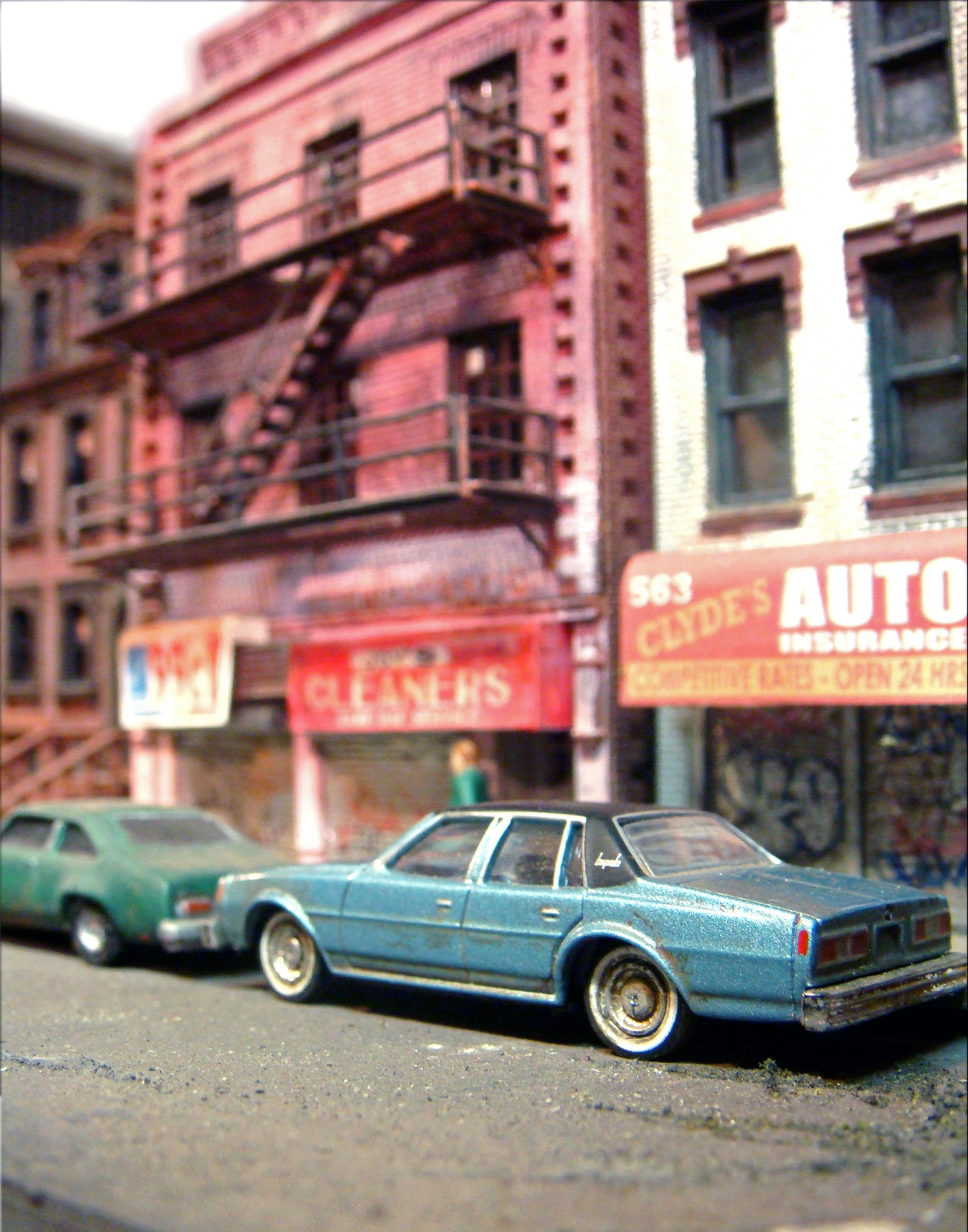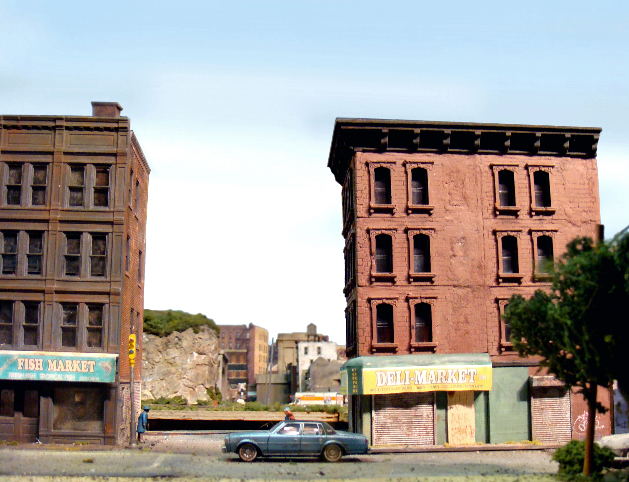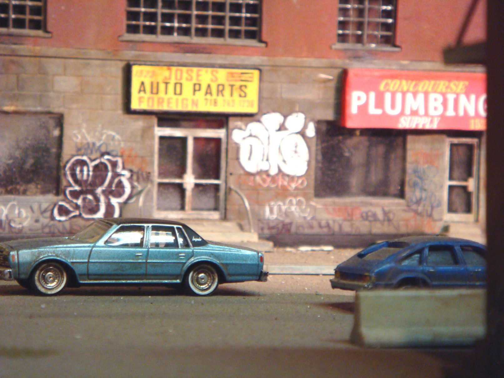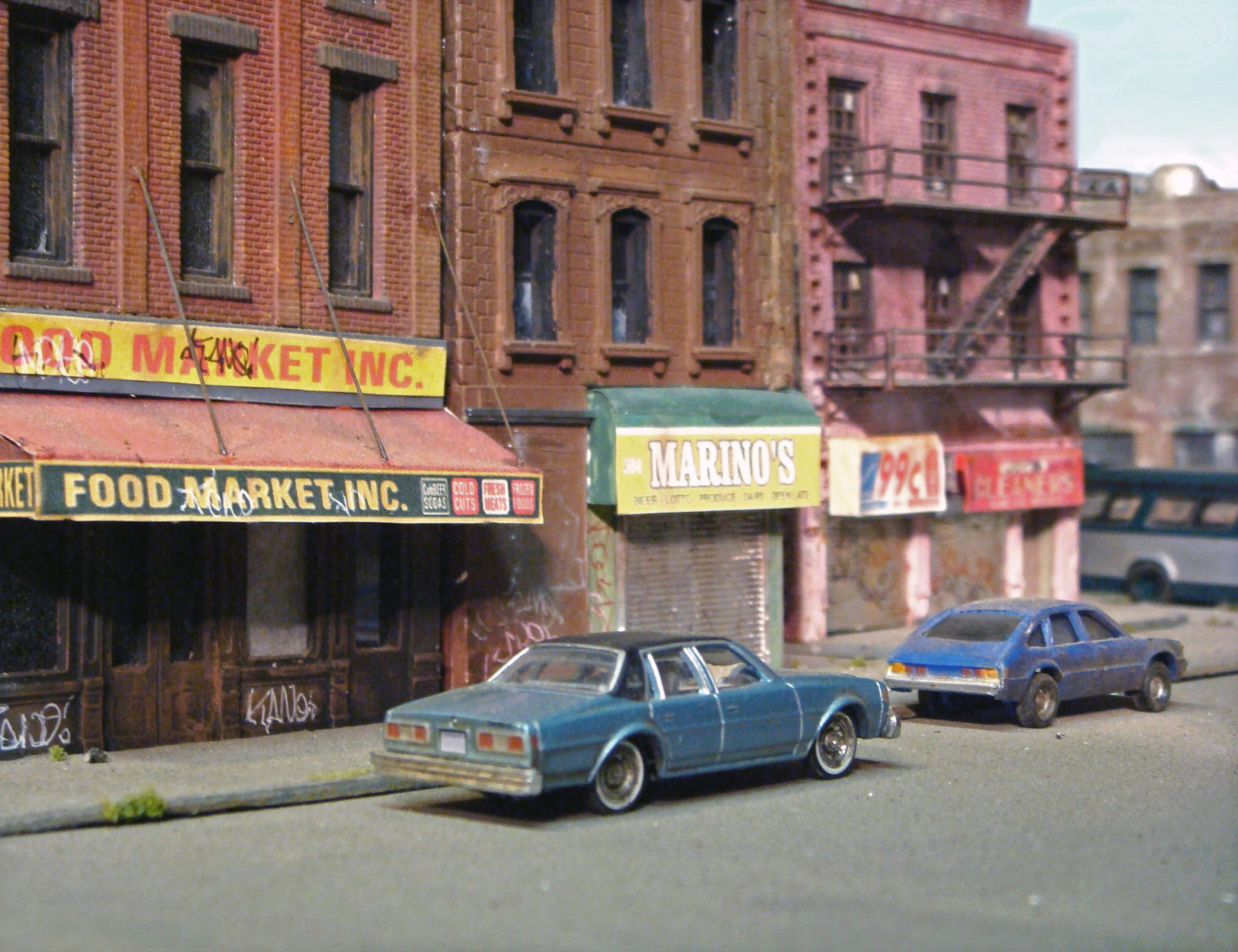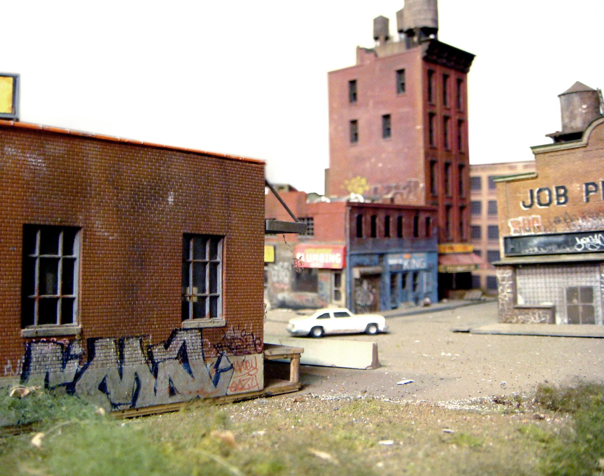 Fascinated by the images of urban decay seen in 2000s-era video games like SimCity and Grand Theft Auto, as well as 1970s-era films like Mean Streets and Wild Style, I created a hyperrealistic, miniature simulacrum of New York City in a similar state of chaos, commenting on both hobbyism and urban voyeurism. Using model railroad kits and plaster casting, I remixed a specific language of signs, fire escapes, water towers, tenements, and lofts that evoked a strong sense of place even though the scenes never actually existed in real life. I then utilized the sets to generate photographs that evoke a cognitive trickery, in which the unreality of the photographs only emerges after minutes of close study. The project draws upon the work of James Casebere and Gordon Matta-Clark.