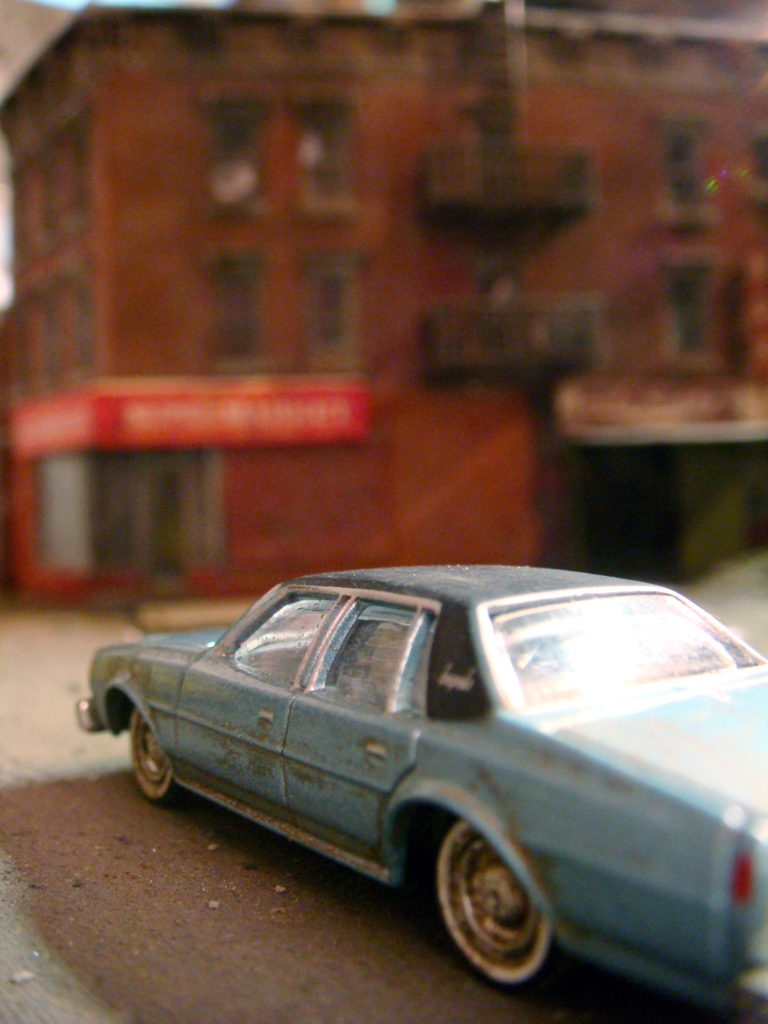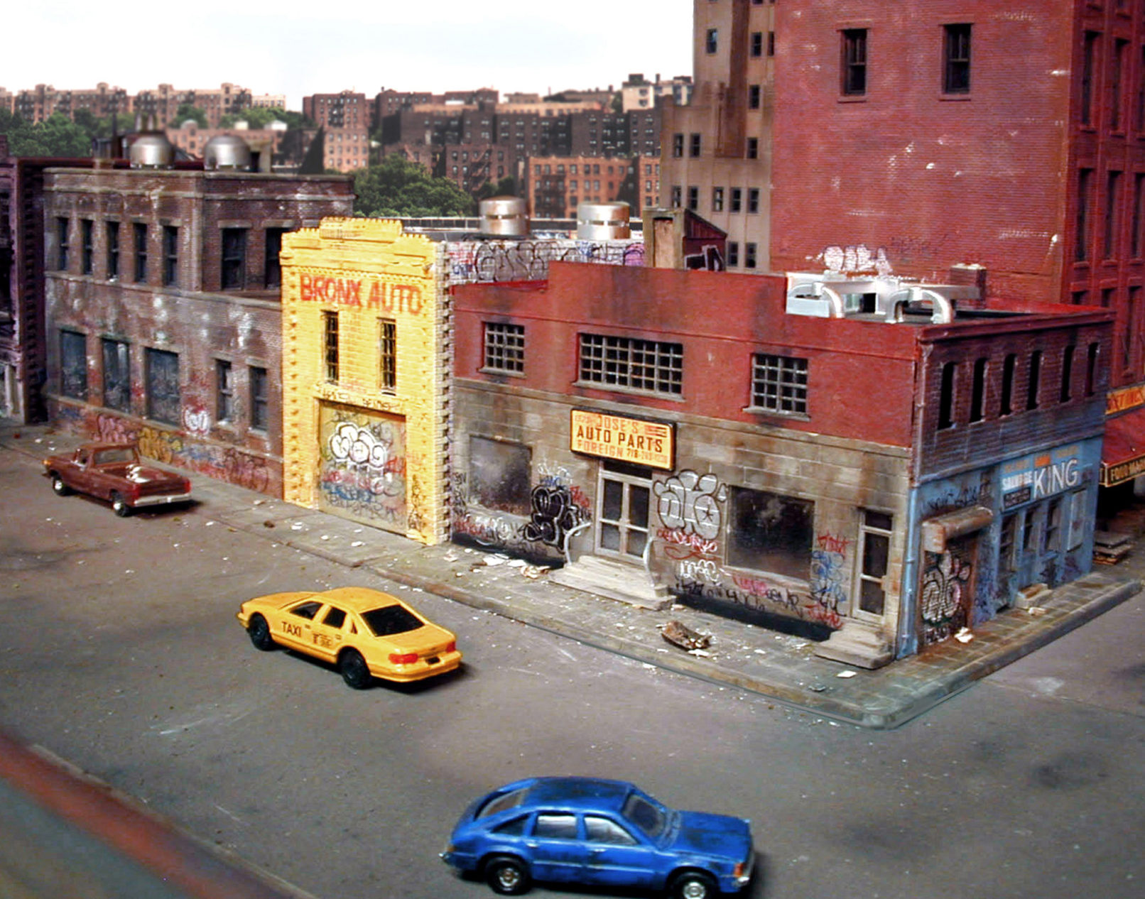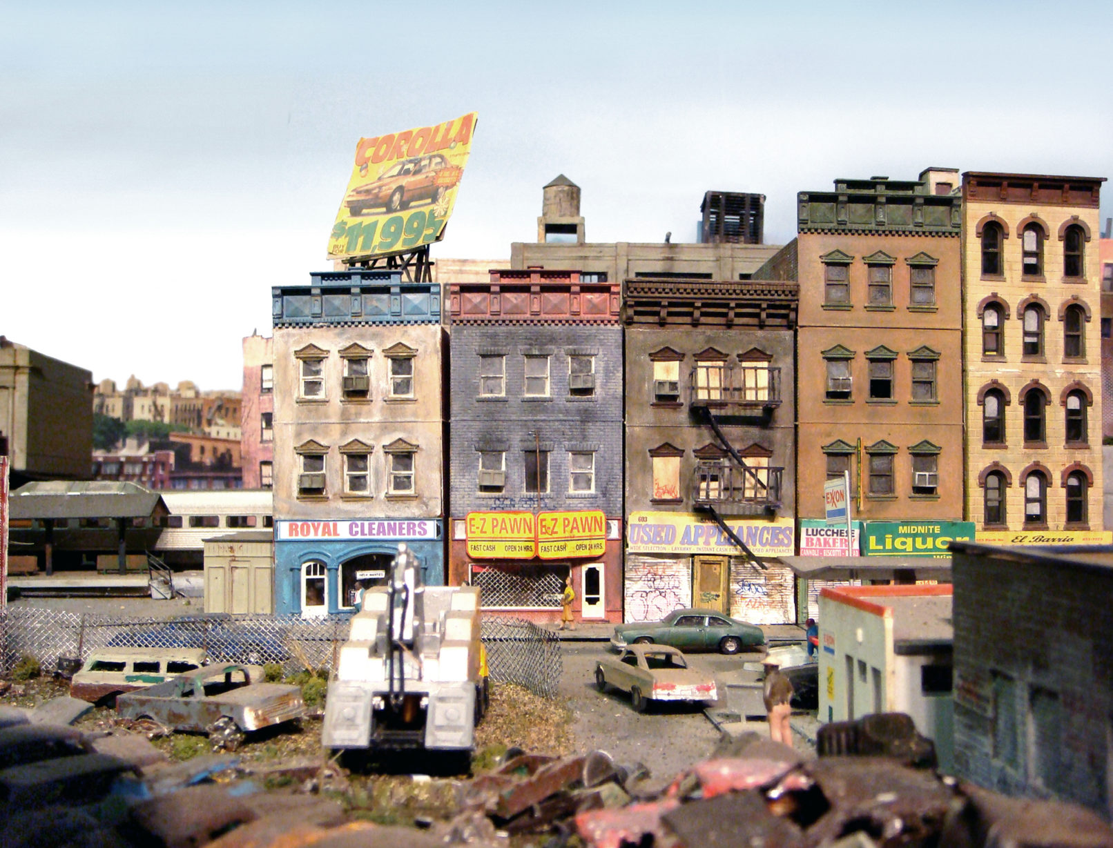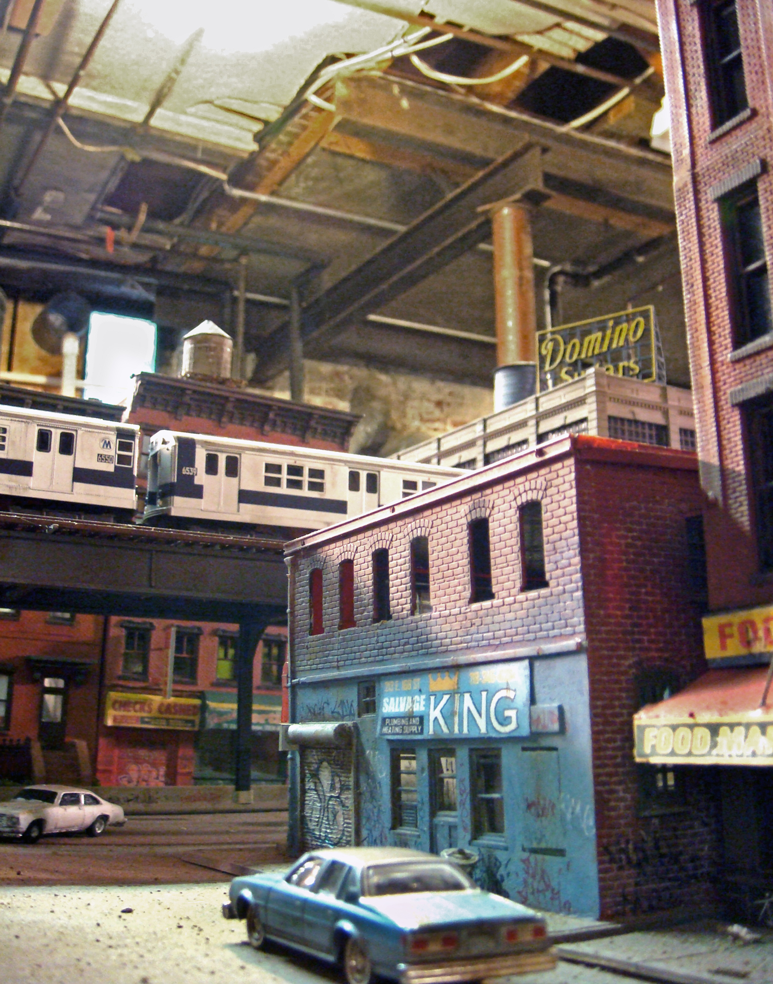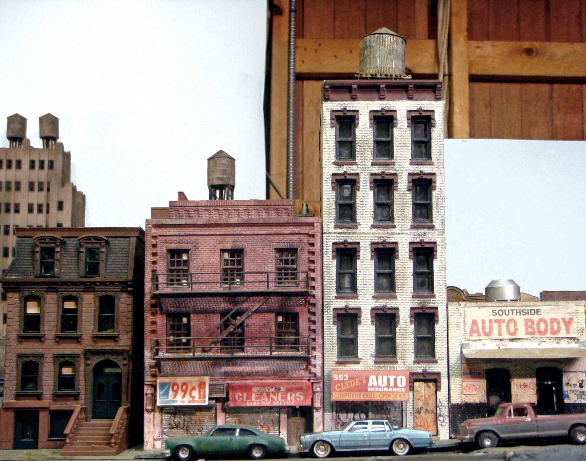 Fascinated by the images of urban decay seen in 2000s-era video games like SimCity and Grand Theft Auto, as well as 1970s-era films like Mean Streets and Wild Style, I created a hyperrealistic, miniature simulacrum of New York City in a similar state of chaos, commenting on both hobbyism and urban voyeurism. Using model railroad kits and plaster casting, I remixed a specific language of signs, fire escapes, water towers, tenements, and lofts that evoked a strong sense of place even though the scenes never actually existed in real life. I then utilized the sets to generate photographs that evoke a cognitive trickery, in which the unreality of the photographs only emerges after minutes of close study. The project draws upon the work of James Casebere and Gordon Matta-Clark.