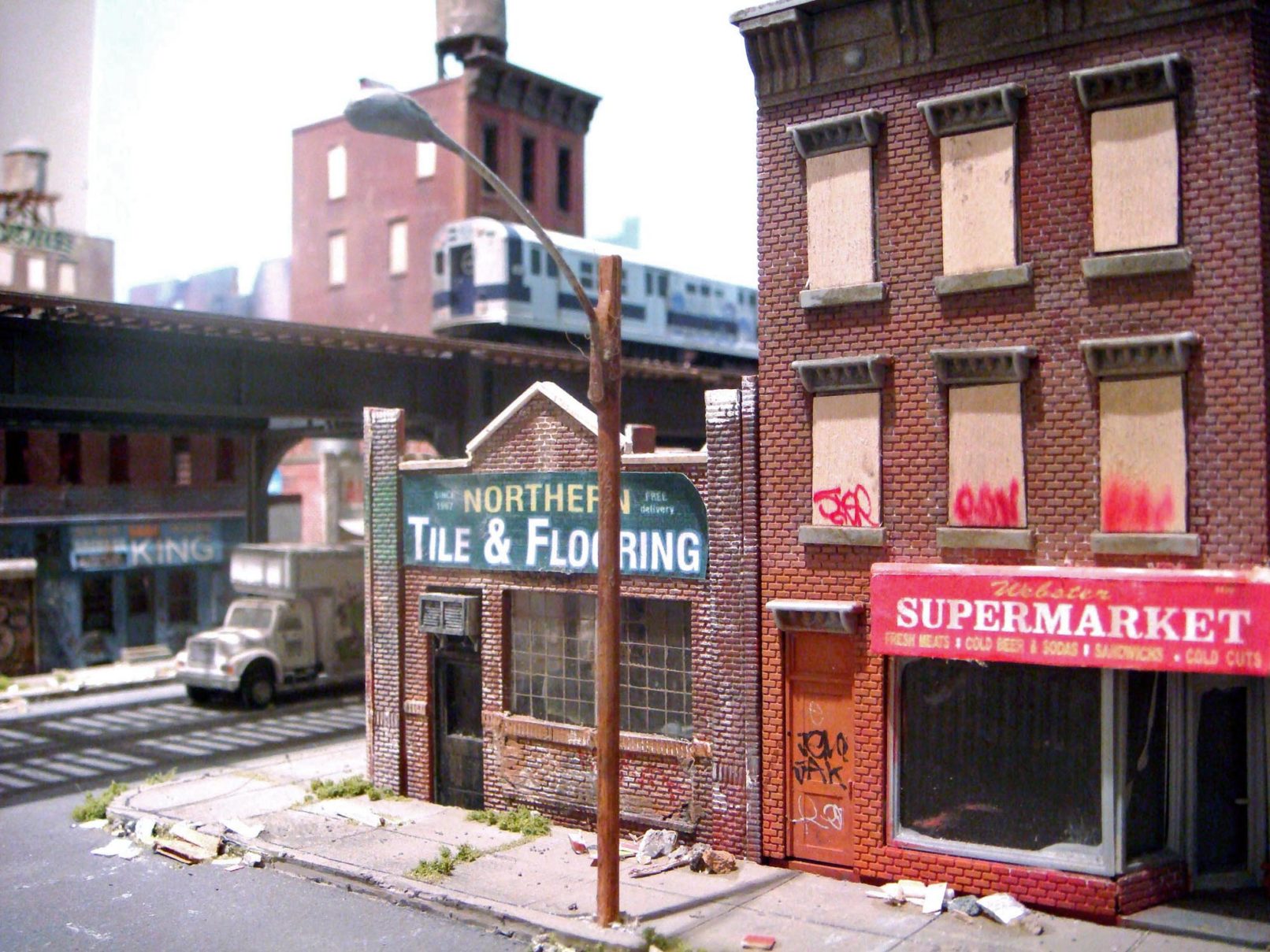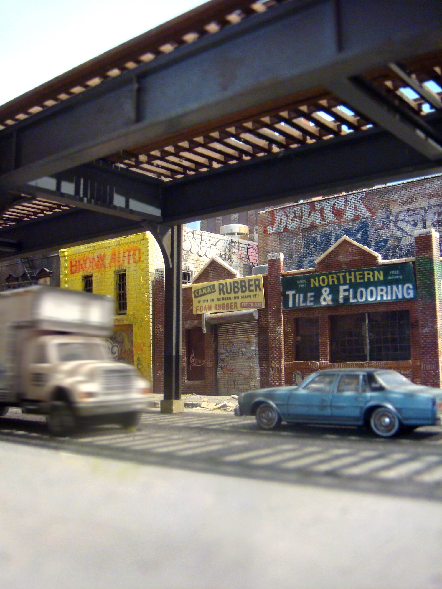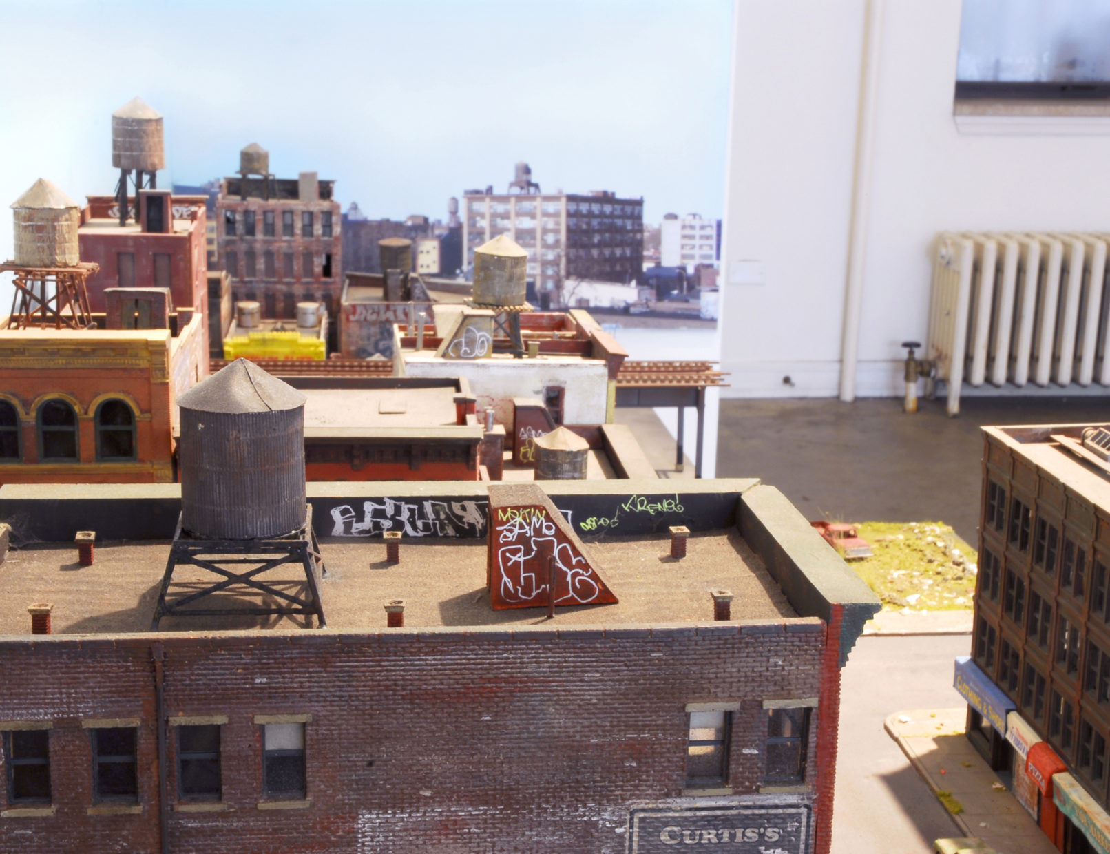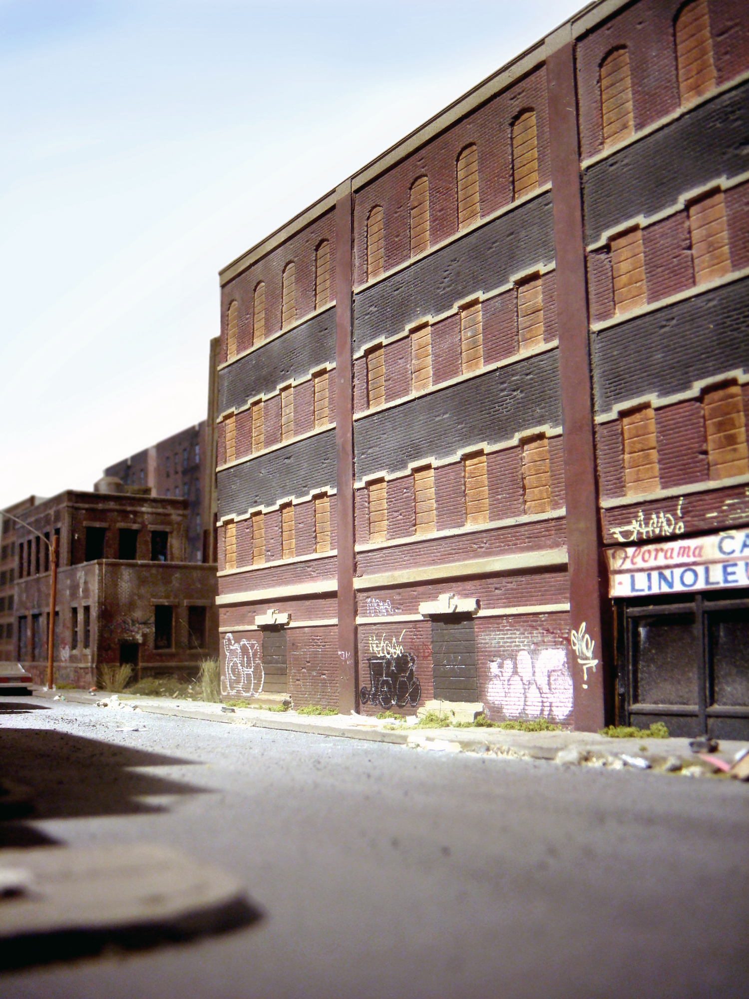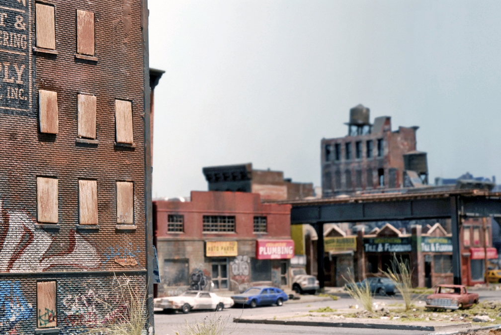 In the second iteration of the series, I adapted my miniature modeling techniques into an installation that was equally immersive but better suited for display in a formal gallery setting, with two compact scenes spread across two levels. The upper level focused on industrial loft architecture, influenced by scenes from Hunts Point in the Bronx and Sunset Park in Brooklyn and the broader postwar decline of American heavy industry. The lower level was a mixed-use neighborhood with tenements and an elevated subway line. When taking photographs of the installation, I experimented with moments of reveal, where the room subtly invaded the frame, creating a surprising negation of the otherwise self-contained scene.