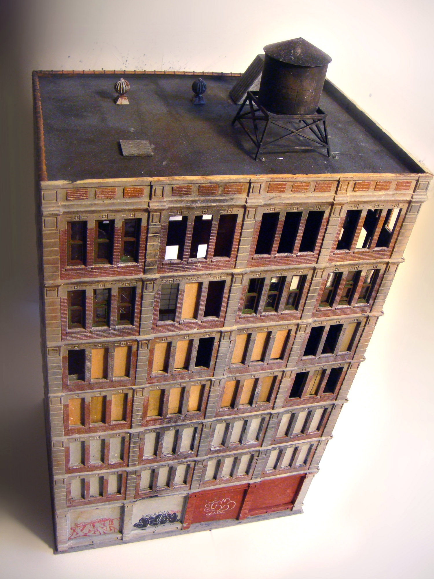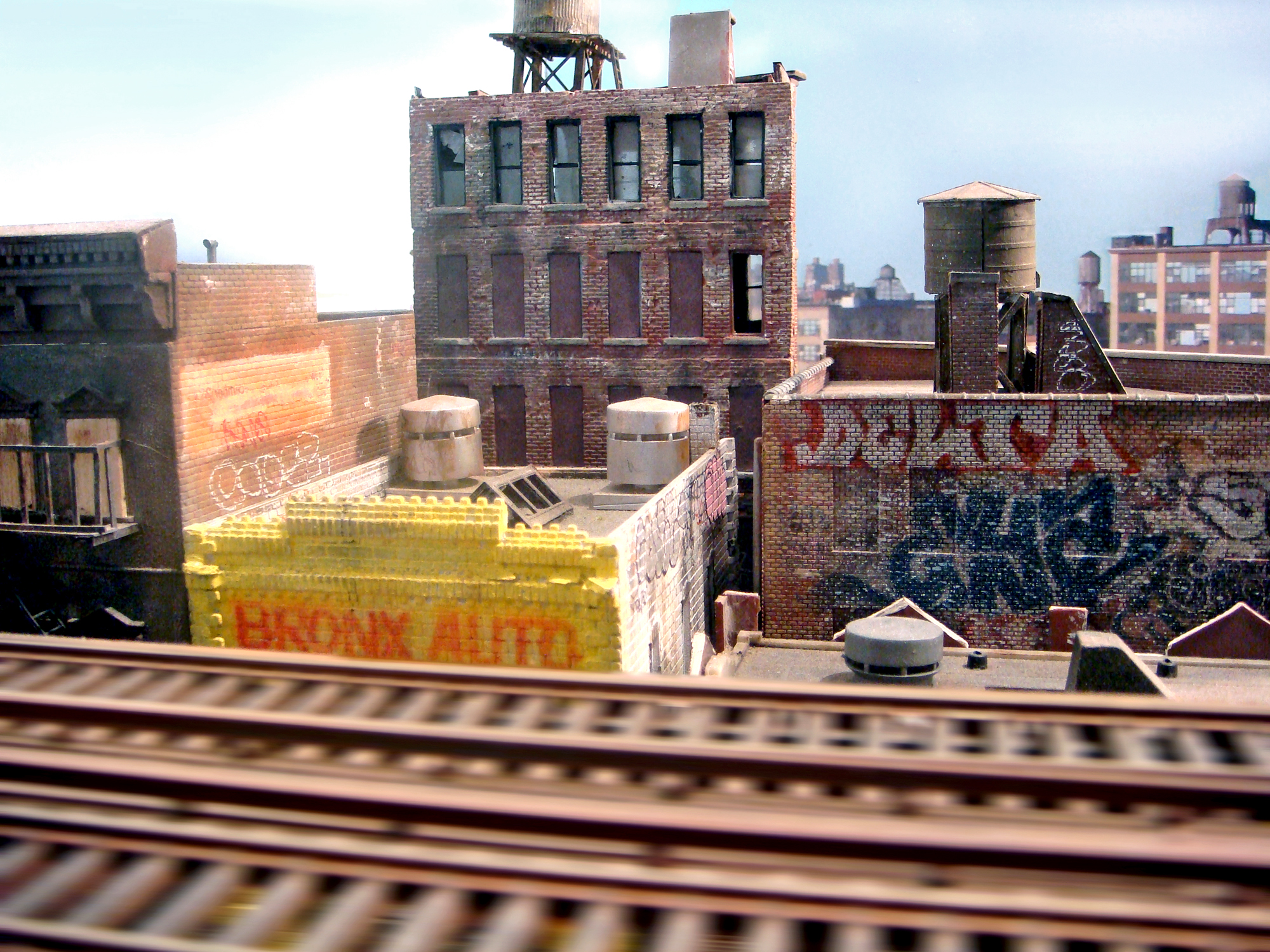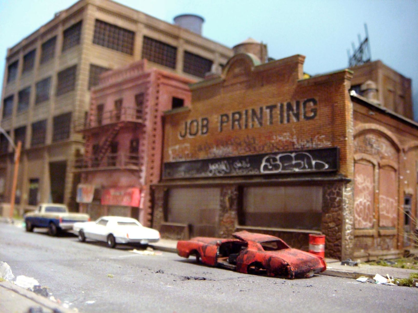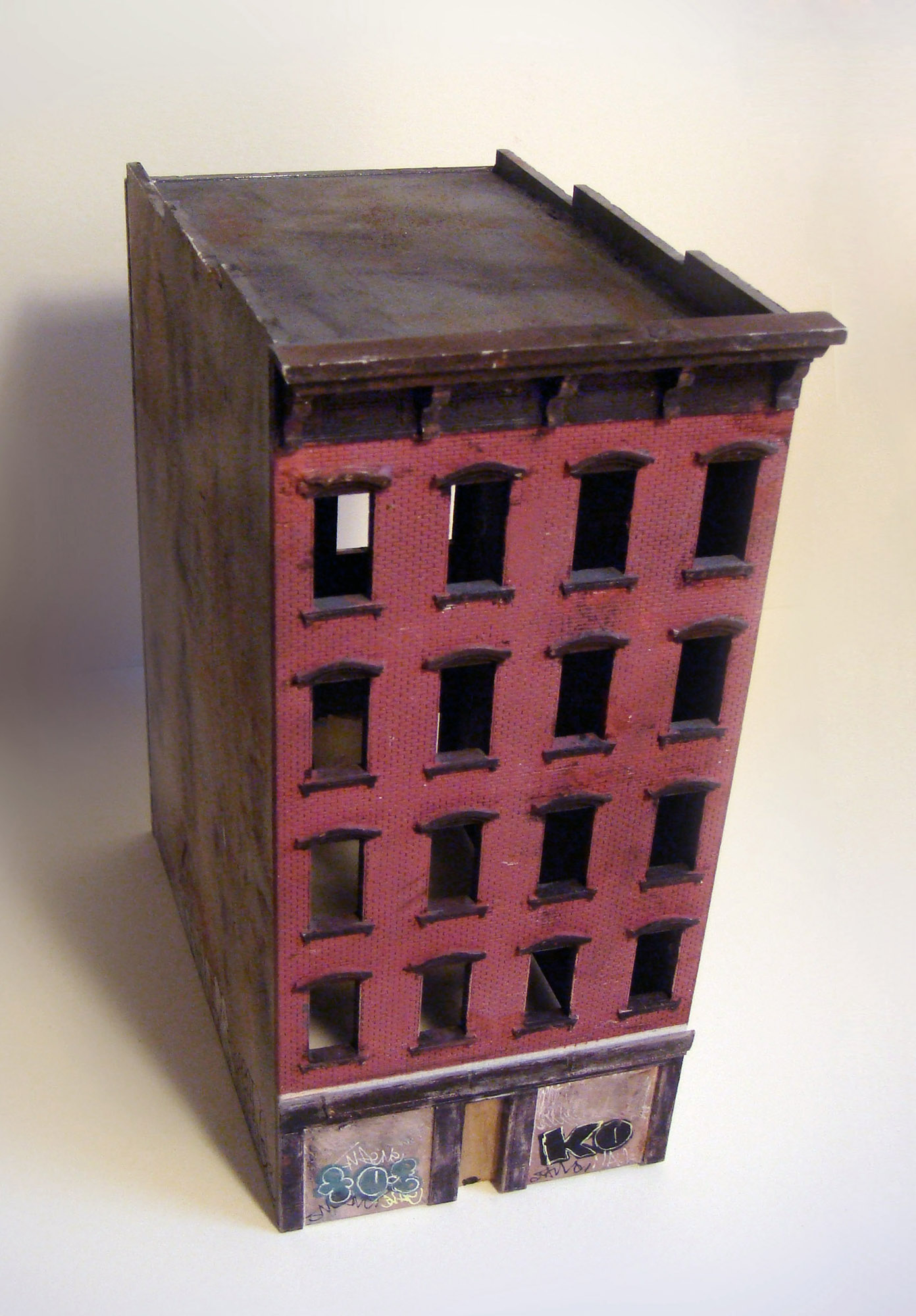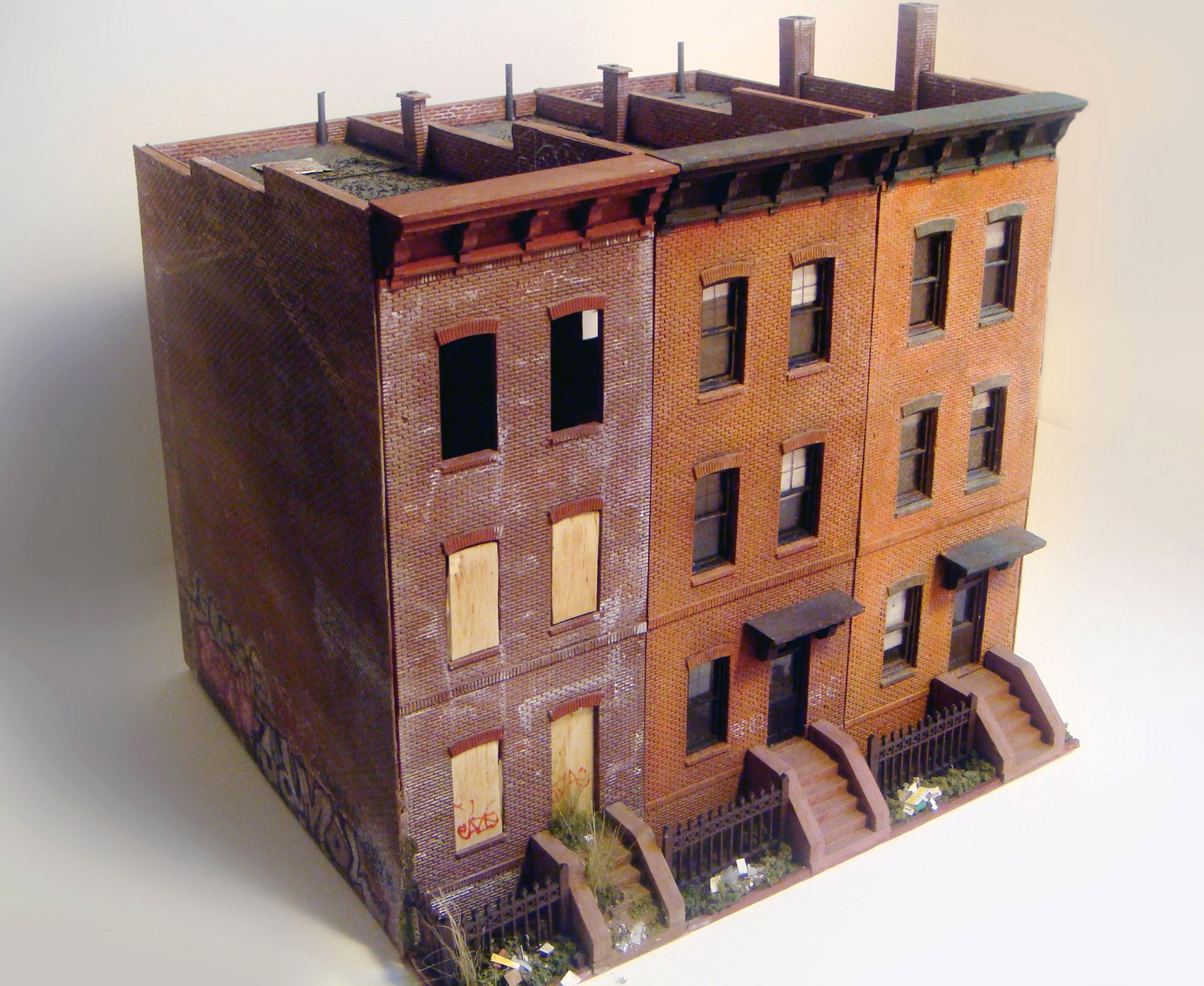 In the second iteration of the series, I adapted my miniature modeling techniques into an installation that was equally immersive but better suited for display in a formal gallery setting, with two compact scenes spread across two levels. The upper level focused on industrial loft architecture, influenced by scenes from Hunts Point in the Bronx and Sunset Park in Brooklyn and the broader postwar decline of American heavy industry. The lower level was a mixed-use neighborhood with tenements and an elevated subway line. When taking photographs of the installation, I experimented with moments of reveal, where the room subtly invaded the frame, creating a surprising negation of the otherwise self-contained scene.