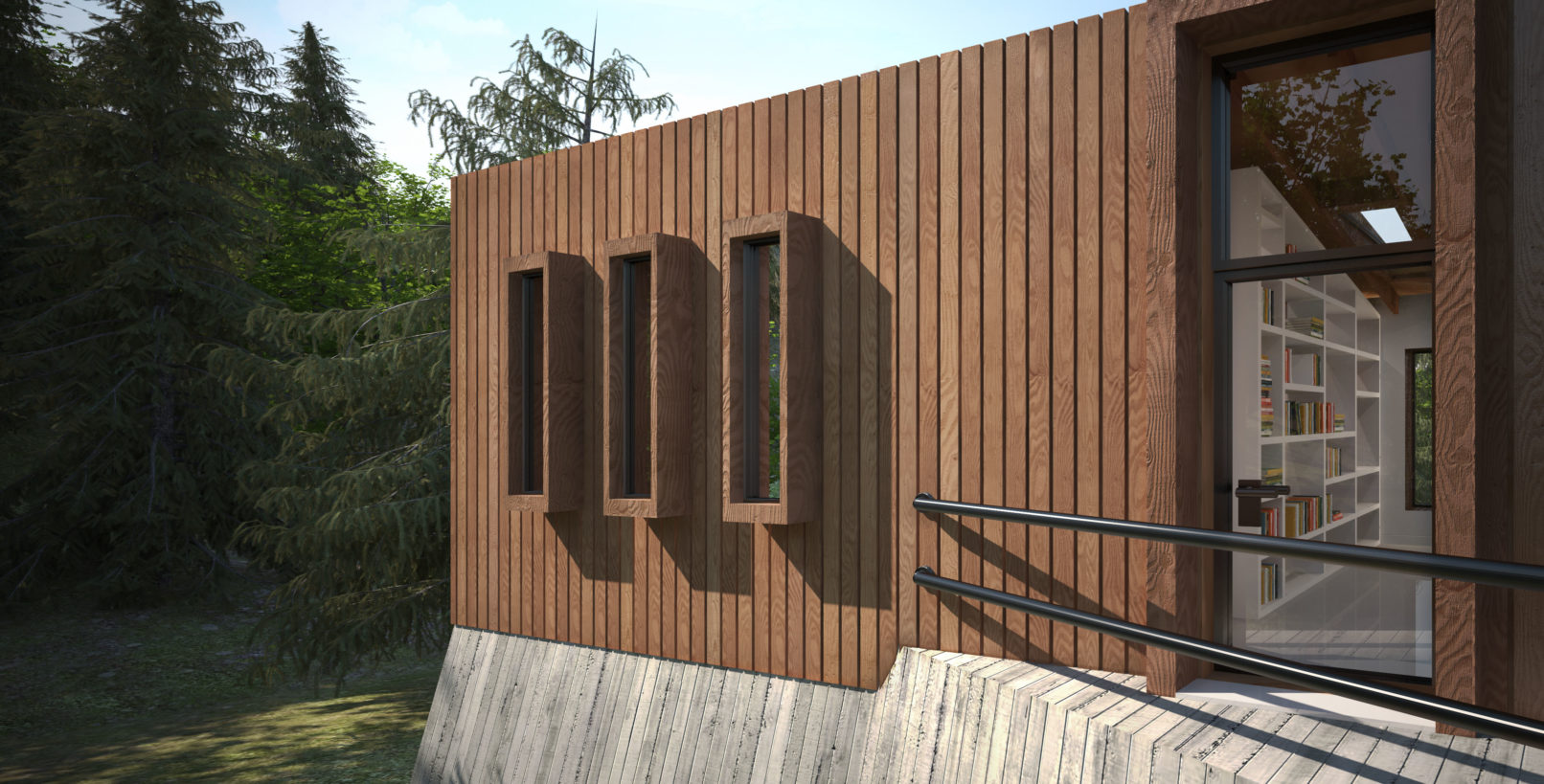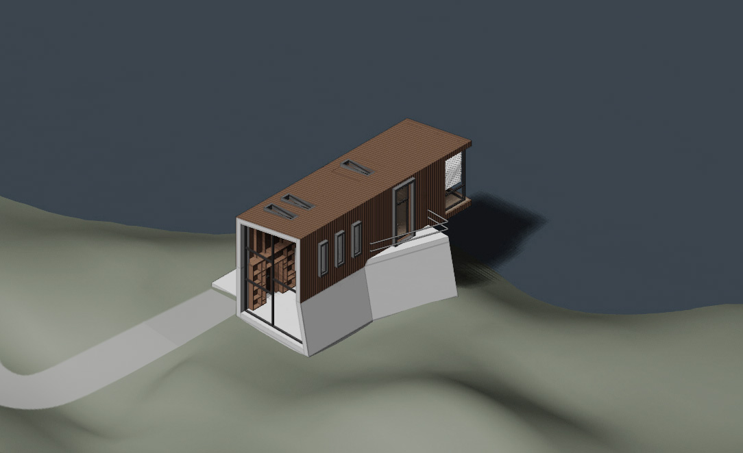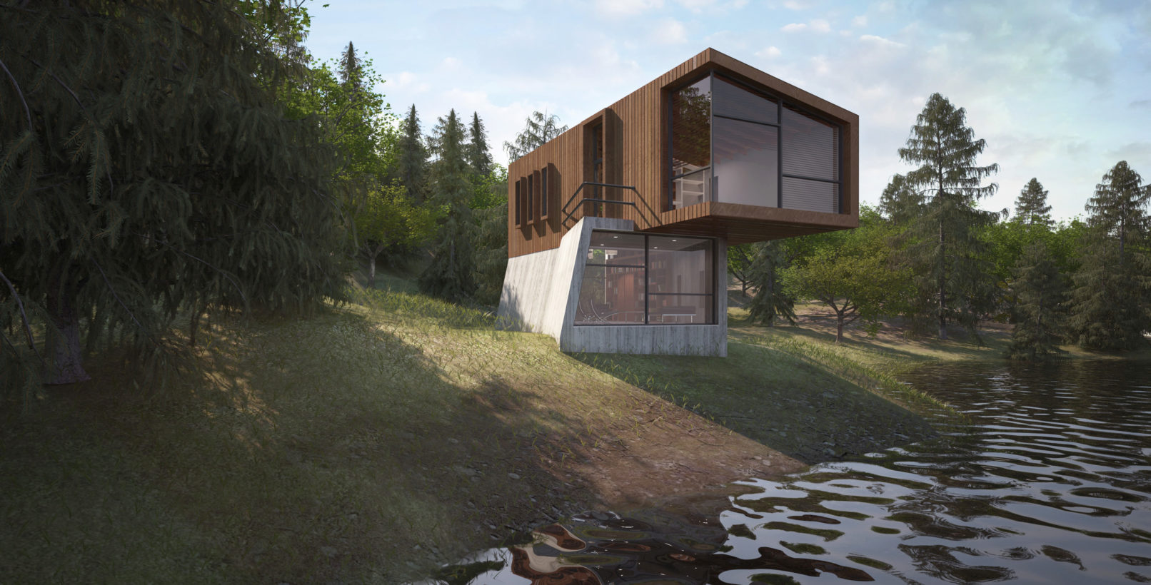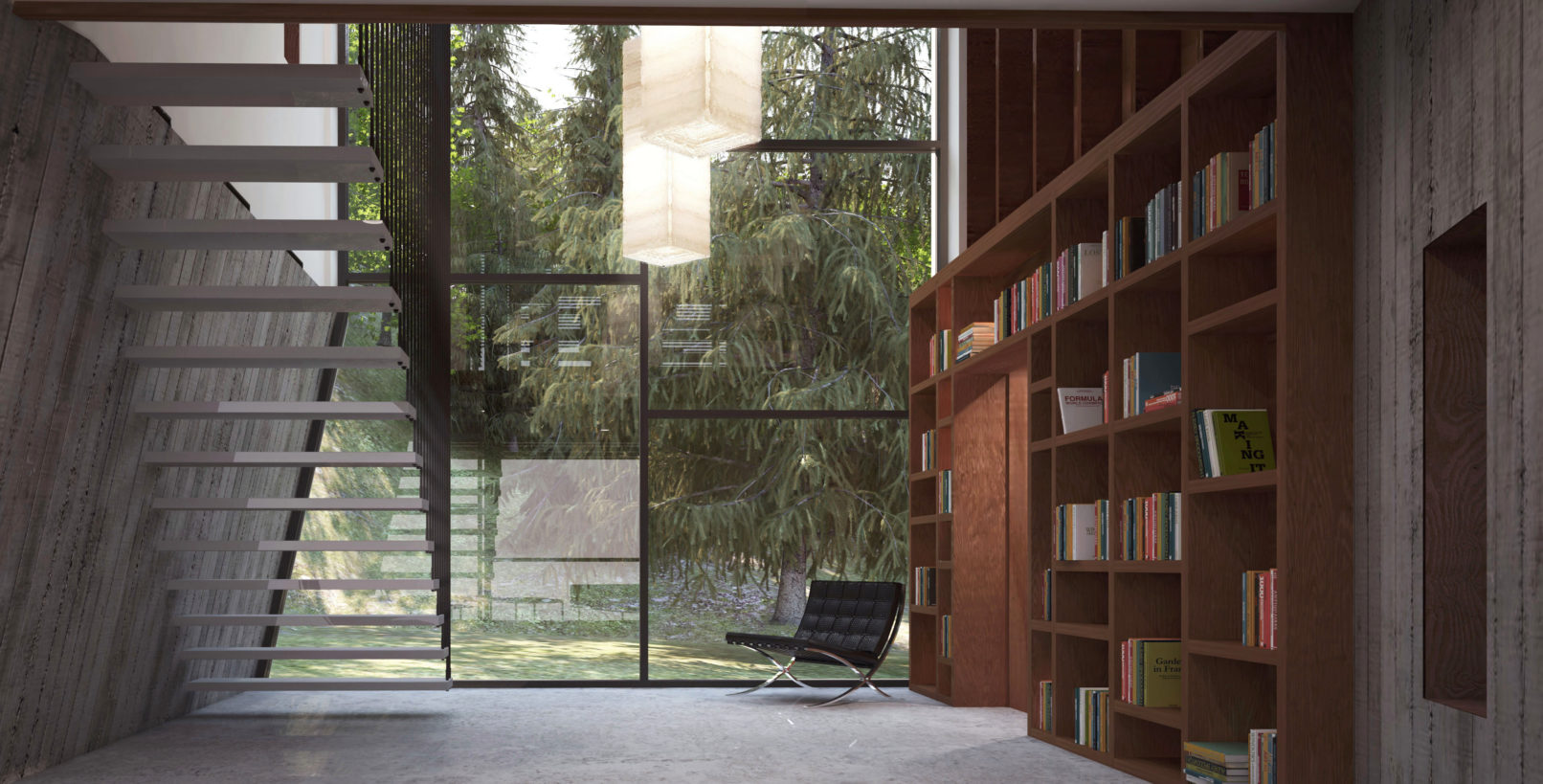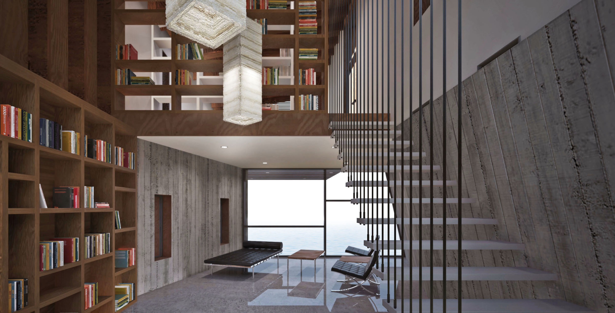 This hypothetical rendering exercise resulted in the creation of a rustic two-story lodge cantilevered over a large lake. The massing concept involves two contrasting volumes of wood and concrete slipping past each other. The interior features a floating staircase and floor-to-ceiling shelves that also act as a room divider on the second floor.